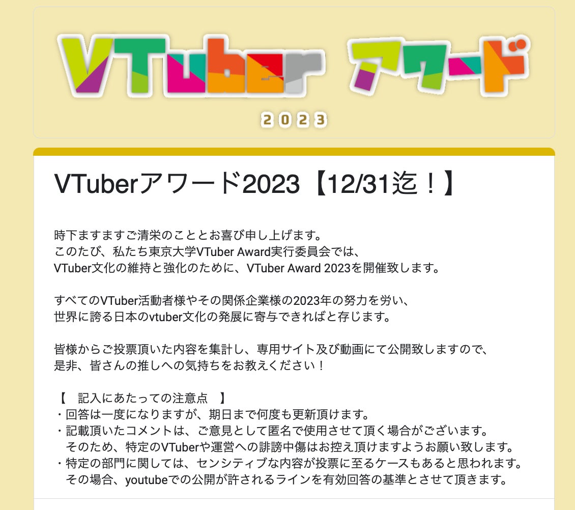 アンケートフォームのリンク:VTuber Award 2023申し込みフォーム