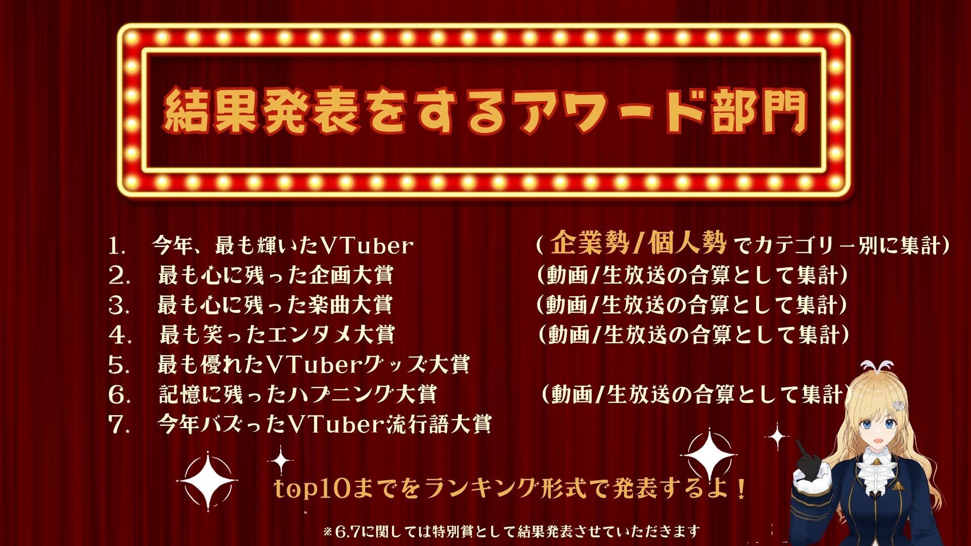 合計7部門に関して、各部門でノミネートされたVTuberさんをトップ10まで、