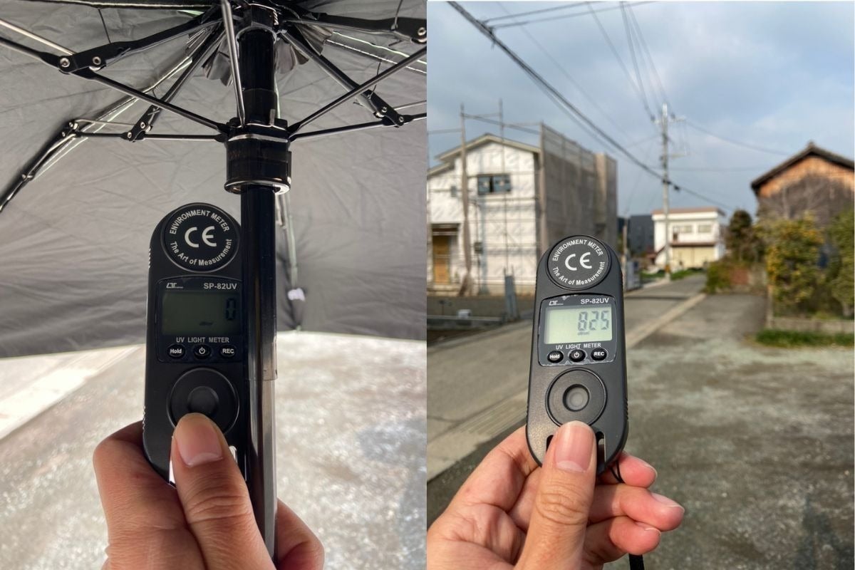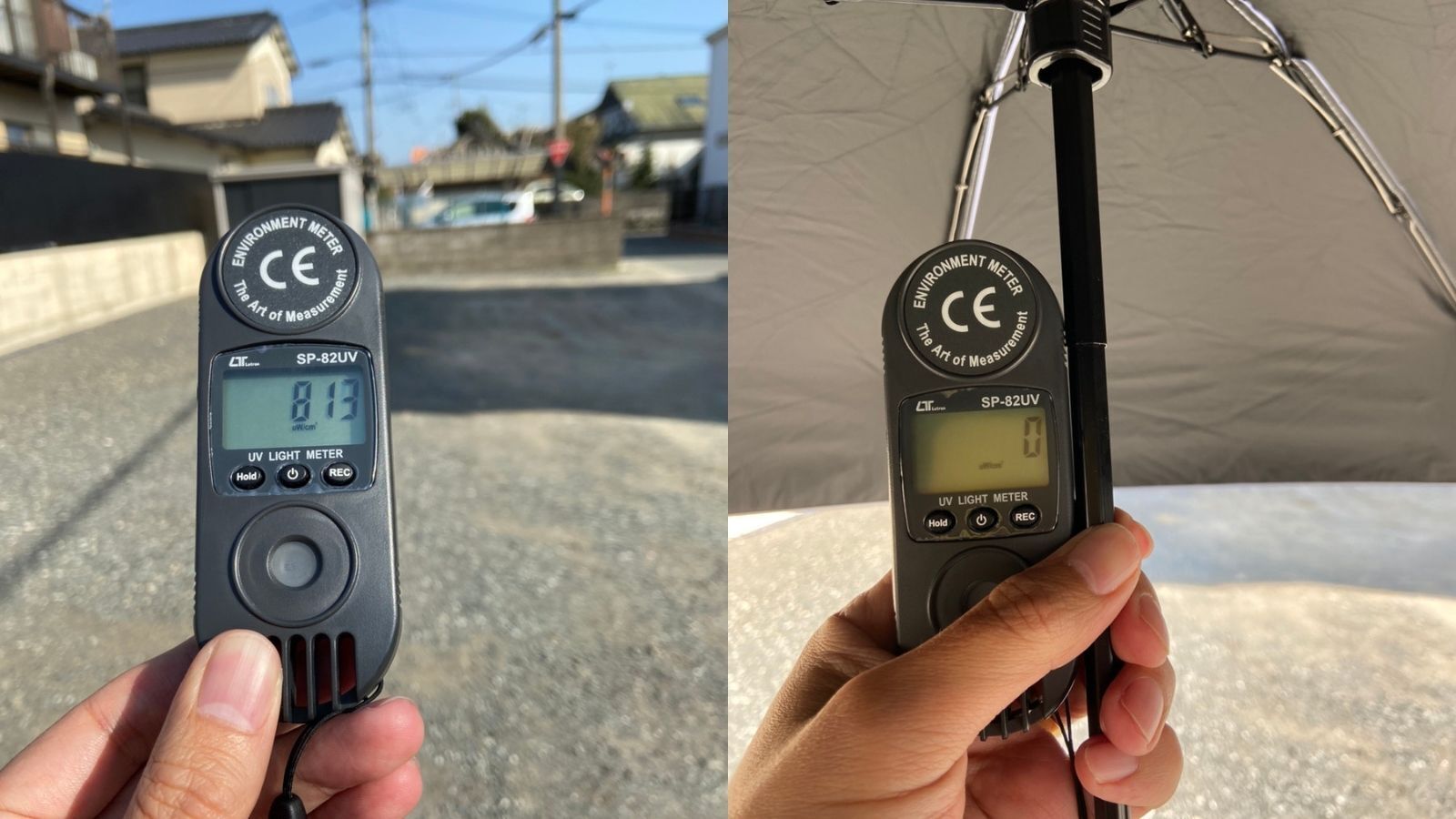 直射日光下での紫外線強度(左写真)pocketumbrella下での紫外線強度(右)