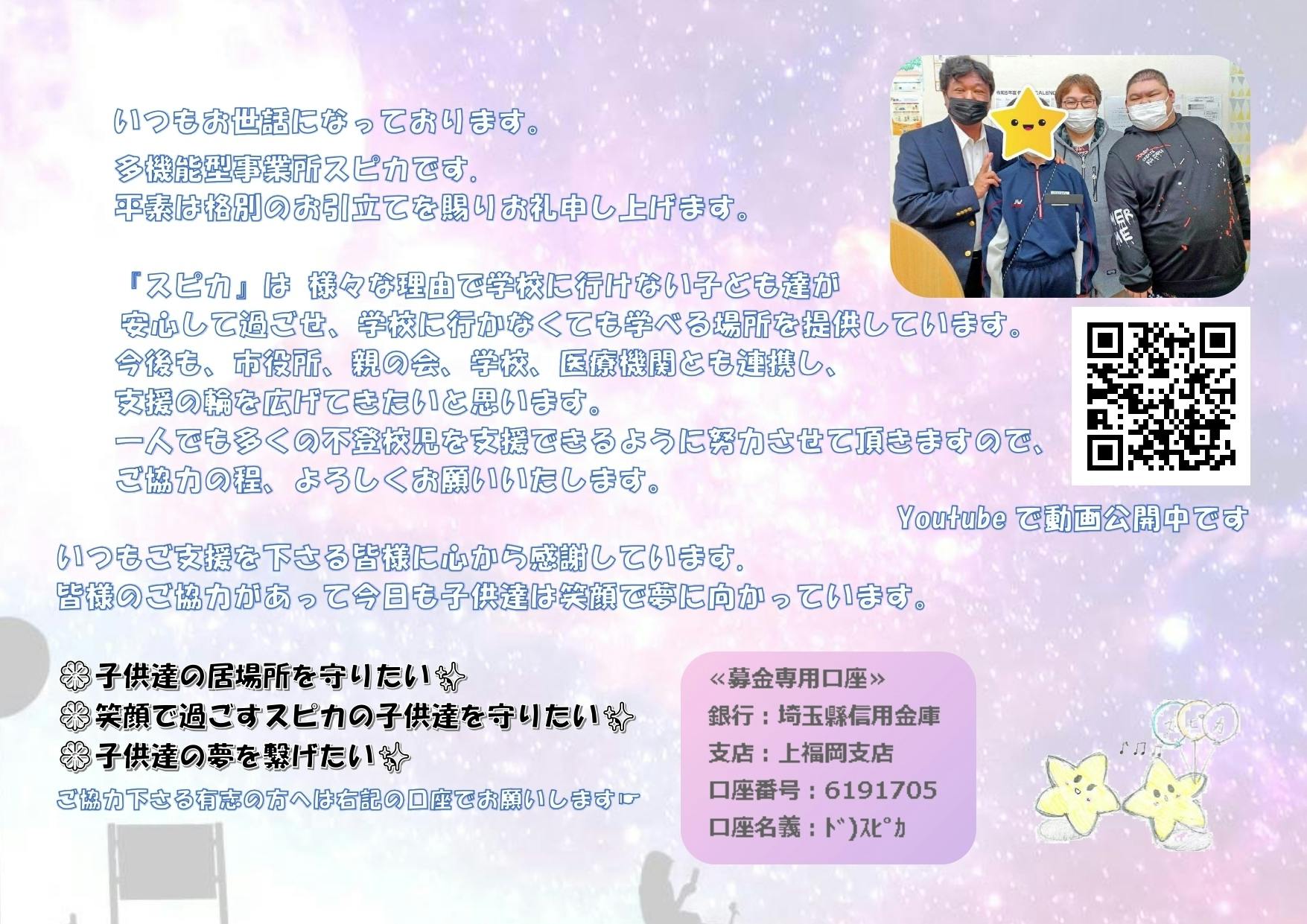 2024/01/31 14:09こんにちは。多機能型事業所スピカです。12月から開始したクラウドファウンディングですが、本日が最終日となります。ご支援、ご拡散頂きました皆様には感謝しか御座いません。本日の日付が変わるまでご支援可能ですので、スピカの不登校児支援に御賛同頂ければご支援のほど、宜しくお願い致します。https://camp-fire.jp/projects/view/726515スピカは、これからも、子ども達と保護者の皆様が安心して過ごせる居場所として頑張りますので、応援宜しくお願い致します。クラウドファウンディング終了後も、募金専用口座にて随時受け付けています。-----------------------------------------------------------------合同会社Spica多機能型事業所スピカ代表社員 新田 哲男〒356-0041埼玉県ふじみ野市鶴ケ舞1-1-18 マンションオオツキ101号TEL:049-257-4411FAX:049-257-4412Mail:spica@bizimo.jpURL:https://fujimino-spica.net/----------------------------------------------------------------- もっと見る
