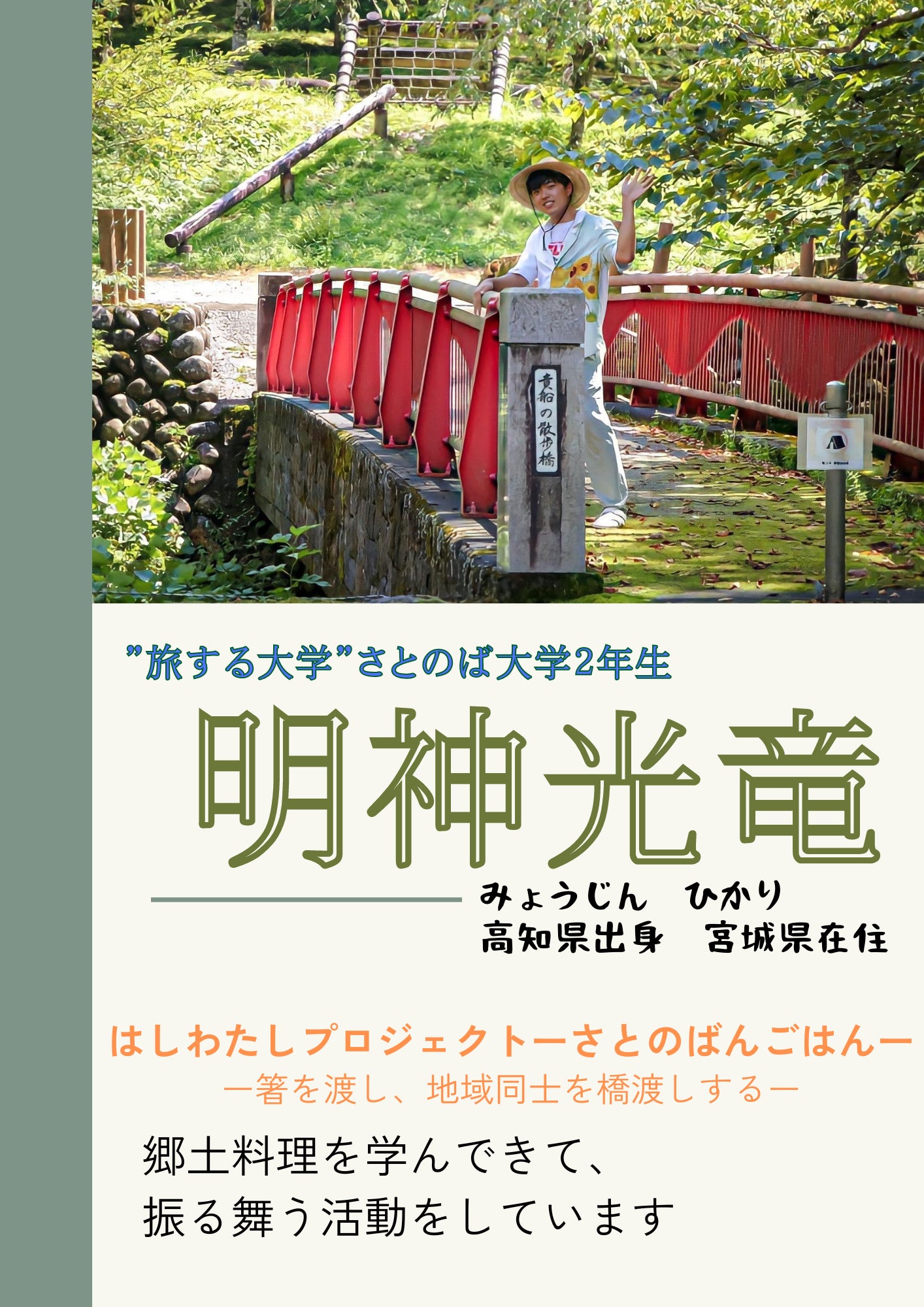 明るい神に光る竜と書いて、明神光竜(みょうじんひかり)です。「地域を旅する大学」こと、さとのば大学の2年生として、生まれ育った「南国土佐」高知県を飛び出し、岐阜県郡上市、広島県大崎上島などを渡り歩いた末、現在は宮城県女川町に地域留学しています。今回ぼくはこういった地域同士を繋げていくために「はしわたしプロジェクトーさとのばんごはんー」を始めました。この活動では、ぼくが旅先で習った郷土料理を全国各地で振る舞うことで、地域同士に想いの橋を渡します。暮らしている地域の郷土料理を習得して、ほかの地域で出会った人に振る舞うんです。