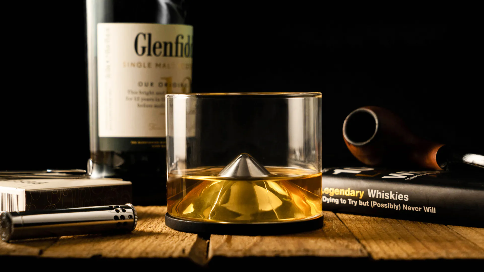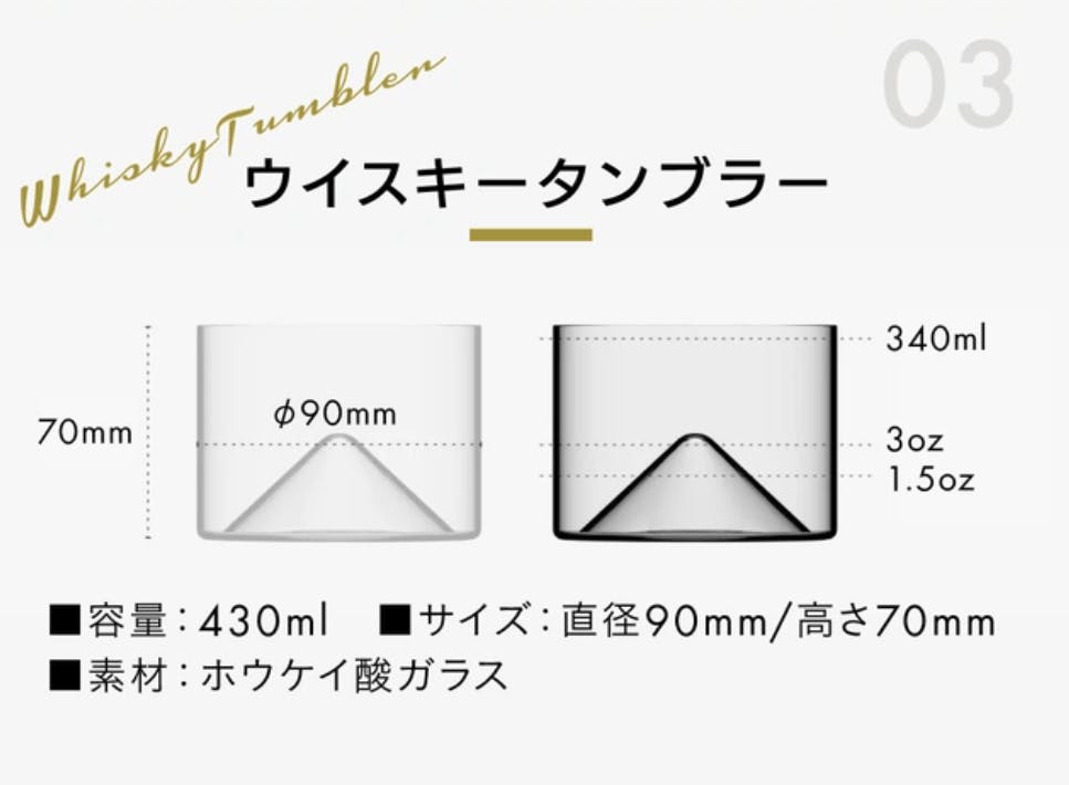 山型のカップ底部と広い口のウイスキータンブラーは、グラスを傾けると鼻が香りのピークに近づくことができ、ウイスキーの香りを感じながら飲むことができます。