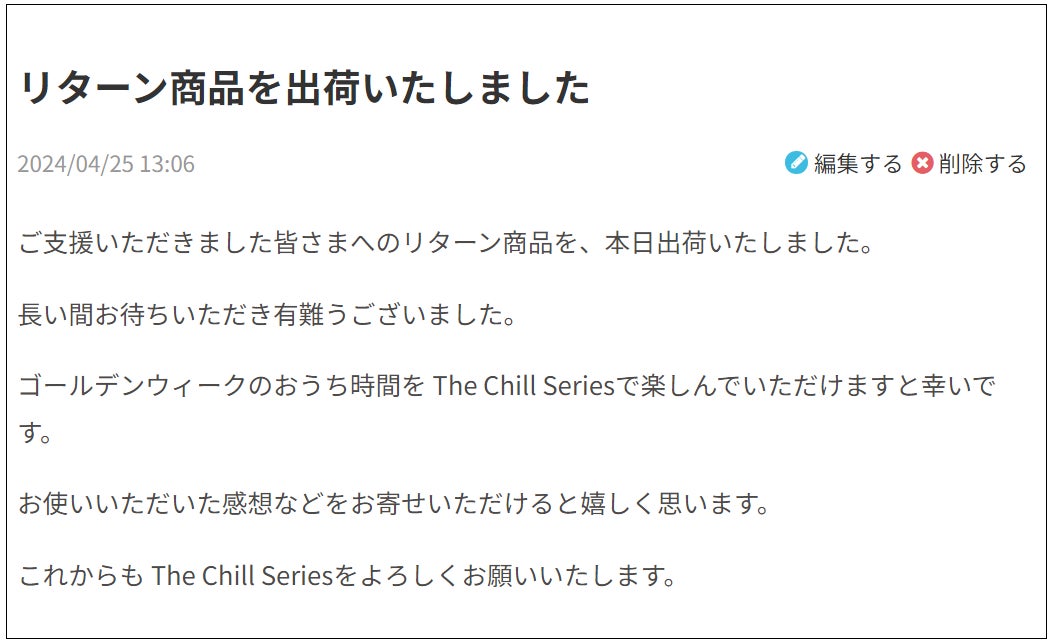2024/04/25 13:06ご支援いただきました皆さまへのリターン商品を、本日出荷いたしました。長い間お待ちいただき有難うございました。ゴールデンウィークのおうち時間を The Chill Seriesで楽しんでいただけますと幸いです。お使いいただいた感想などをお寄せいただけると嬉しく思います。これからも The Chill Seriesをよろしくお願いいたします。 もっと見る