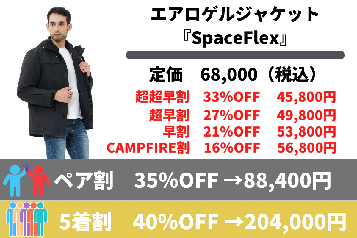 2024/03/11 19:13ご支援者の皆様、ページをご覧の皆様、こんばんは!AGERU厳選ショップです。現在も、たくさんのご支援いただき心より感謝申し上げます。今回は、3IN1エアロゲルジャケット「SpaceFlex」について機能性・ご着用シーンについて紹介させていただきます!3IN1エアロゲルジャケット「SpaceFlex」(スペースフレックス)は宇宙服素材を惜しまなく採用し、高機能性・収納性にも優れた究極の1着で、寒い冬だけでなく、春秋にもお使いいただけます。暖かい・防寒・断熱についてはもちろんですが今回は、春にも大活躍する「SpaceFlex」についてご紹介させてください!春と言えば・・・花粉や黄砂の舞う季節ですが、、お花見や登山、サイクリング、ピクニックやキャンプなど行楽シーズンとなりますね!そんな行楽シーズンにも「SpaceFlex」は大活躍します!例えば・お花見で昼間は暖かいのに、夕方から急に肌寒くなる。・春の登山では寒暖差が激しく、衣服の調節が難しい。・サイクリングでは、日差しが強いのに急に風が強くなったり、冷たさを感じたり。・ピクニックやキャンプでは天気の移り変わりや気温の変化が大きい。・花粉や黄砂が衣類に付着して不快。などなど、春は想定しにくい天候や気温の日が多くなる季節。そんな時、「SpaceFlex」の出番です!アウターのみをご着用していただると、不安定な天気の多い春にも活用していただけます。また「SpaceFlex」は、ポケットも多く、旅行先やお散歩に手ぶらで出かけられます!※インナーダウンを使用しない場合、インナーダウン内ポケット8個除く防風・防水仕様となっており、雨や風対策もバッチリです!https://static.camp-fire.jp/uploads/editor_uploaded_image/image/3509896/cb0cacd988e58278df5efca7934e00a9.GIF?ixlib=rails-2.1.4&fit=max&auto=formathttps://static.camp-fire.jp/uploads/editor_uploaded_image/image/3509915/82bb1555638a4450b6feff1b6e7e0772.gif?ixlib=rails-2.1.4&fit=max&auto=format服の表面には風を通さない防風機能が備えているので、バイクや自転車などで風に強く当たる方にもお勧めです。是非、この機会にお試しください!皆様に良い商品をお届けできるように頑張って参りますので、引き続きAGERU厳選ショップをよろしくお願いいたします。AGERU厳選ショップスタッフ一同 もっと見る22個ポケット付きで手ぶらでGO「3WAYアウター」の便利機能!