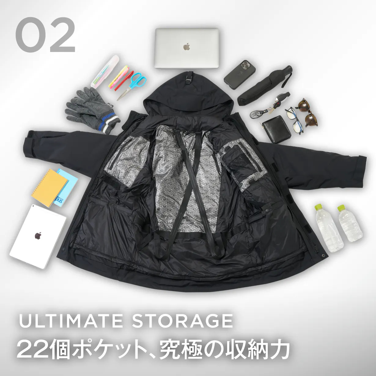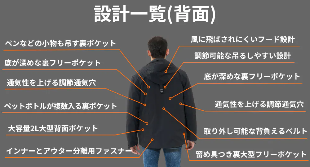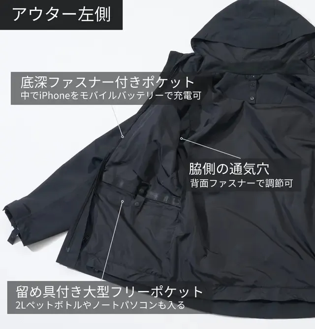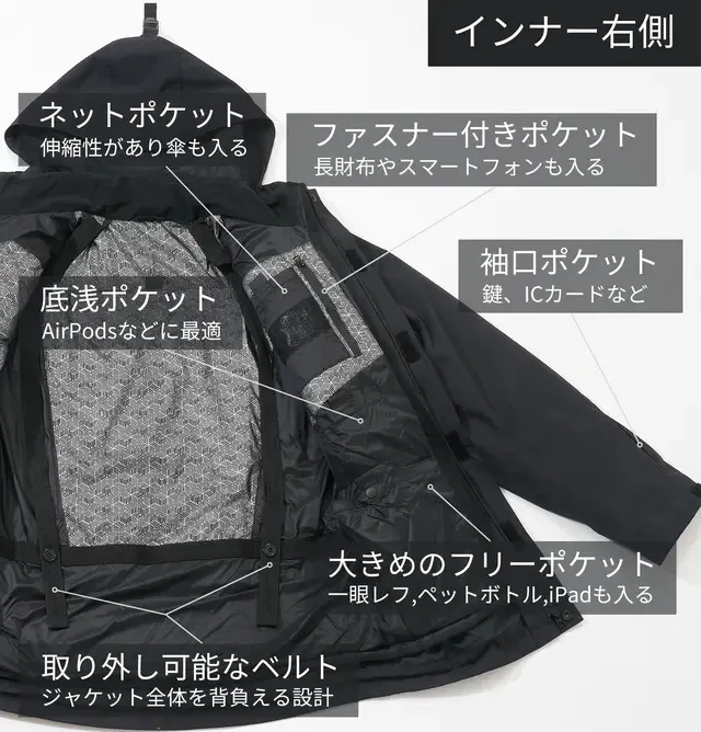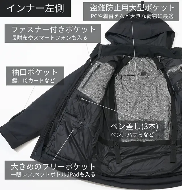驚異の収納力を実現、22個ポケットを搭載!この1着あれば、手ぶらでお出かけ!3WAYの自由自在なデザイン!春や秋には取り外し可能なインナーダウンで、梅雨の時期にはジャケットだけで軽やかに、そして寒い冬にはインナーダウンを組み合わせて防寒性を倍増。一着で四季を通じてお使いいただけます。