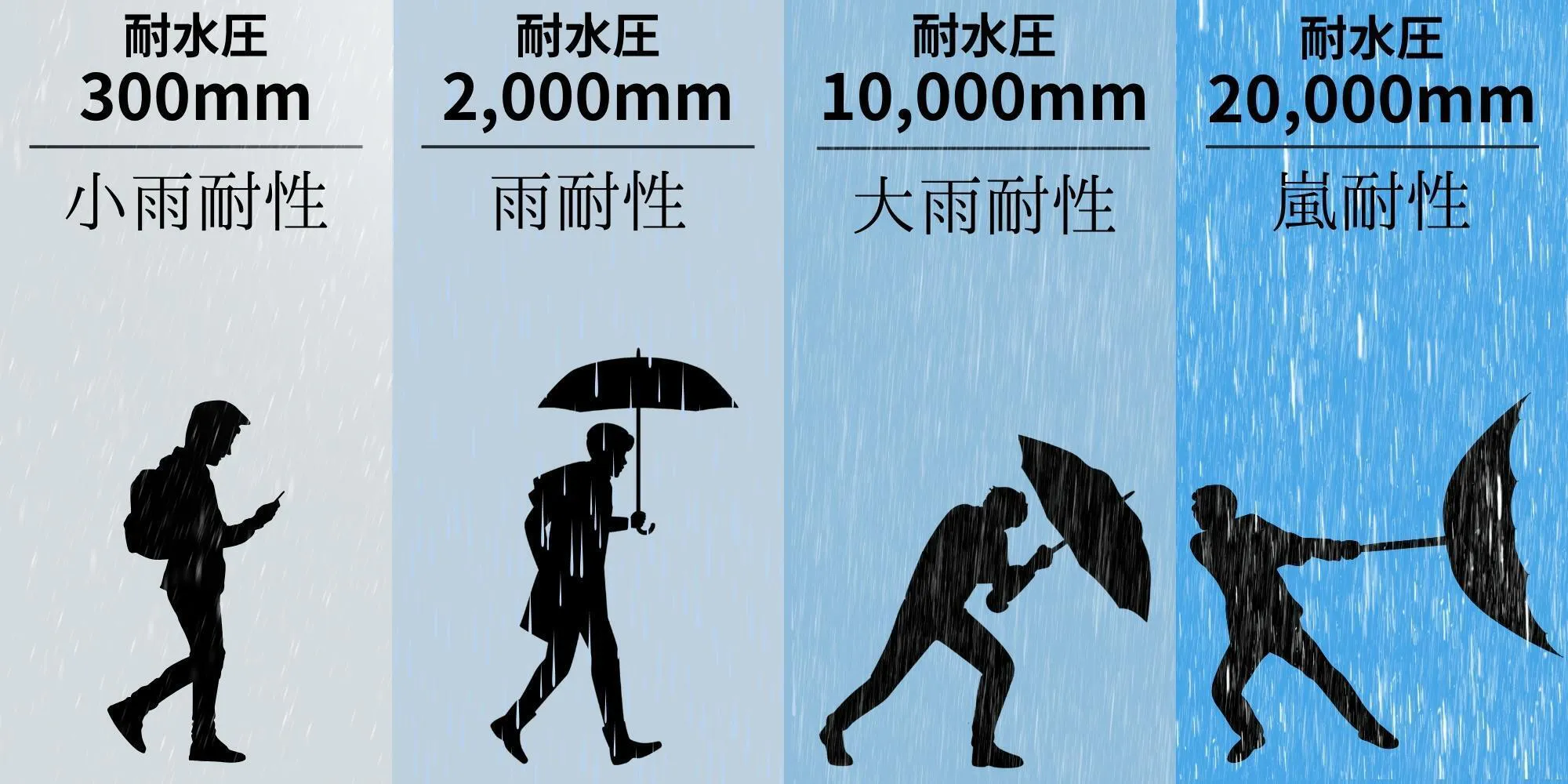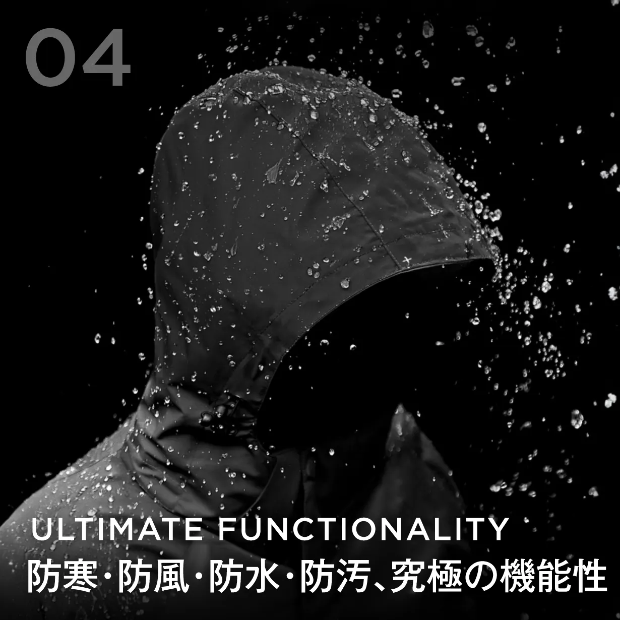 嵐をものともしない、大雨からも守り切る耐水圧20,000mmの極上ファブリック。※耐水圧は使用している生地単体での数値です。本製品での耐水圧試験は実施しておりません。