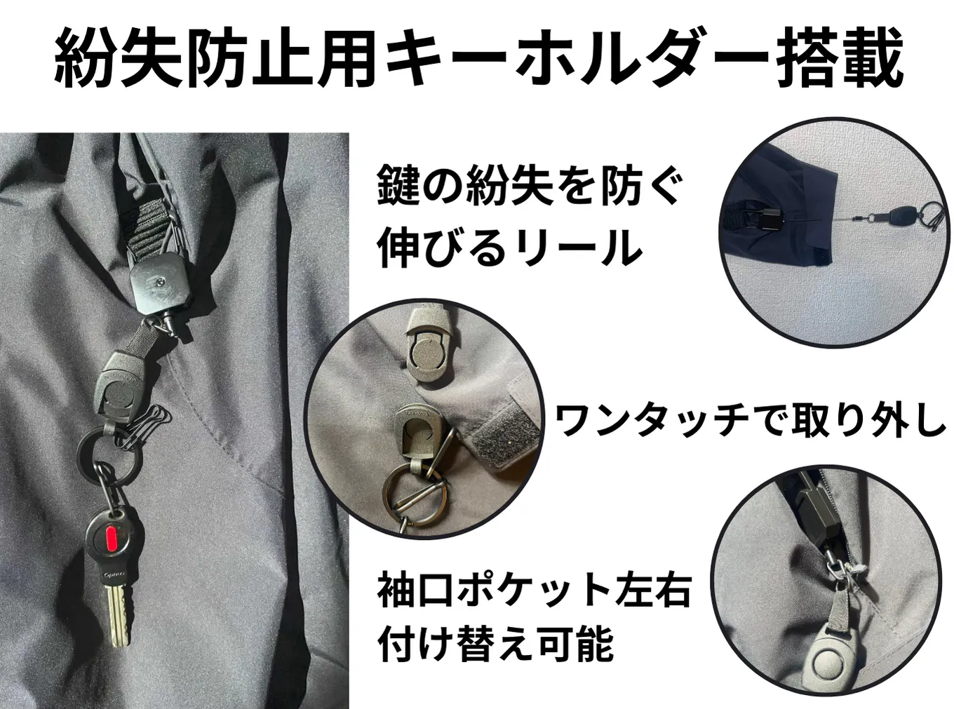 1、リールキーホルダー搭載で、さまざまな使用シーンに対応!