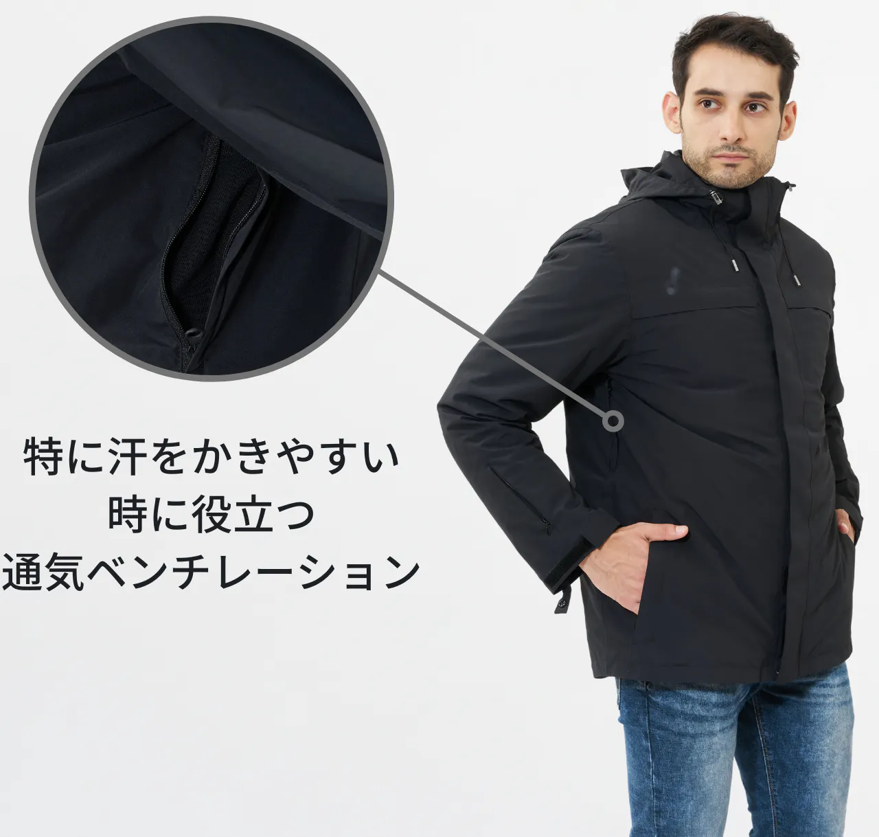 脇の下にベンチレーション(通気孔)も実装しているため、電車など急に暑くなった場合も快適に過ごせます。
