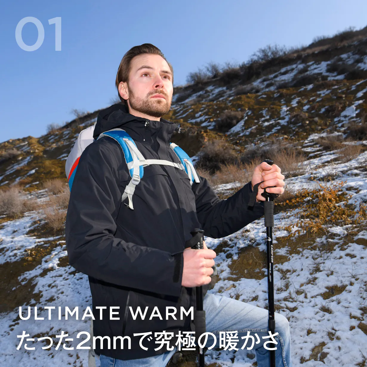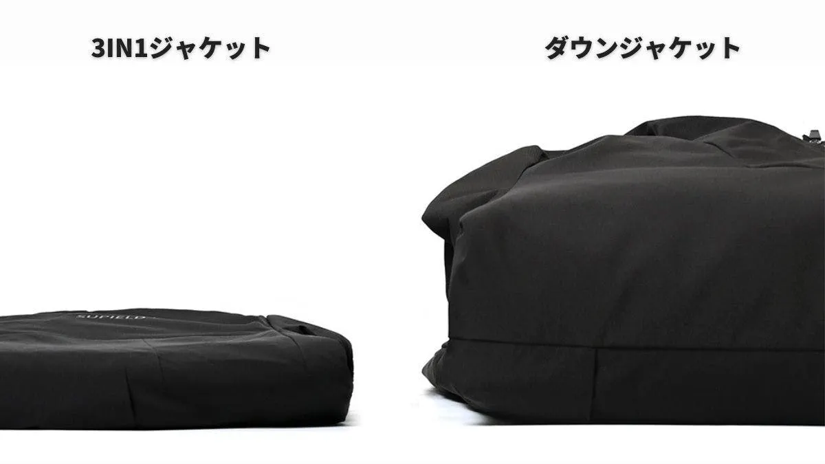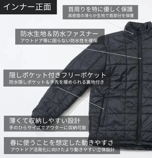 従来のジャケットで同等の保温性を保つには、1㎏以上の重量を必要としていたことに対して3IN1エアロゲルジャケットはわずか2mmのエアロゲルを採用しており、厚さは一般のグースダウンの1/3となります。