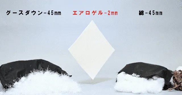非常に軽く、断熱性の高い「エアロゲル」は、その断熱性の高さから過酷な環境で着用する”宇宙服”にも使われている素材です。わずか2mmという薄さで-196℃の冷気も断熱できます。