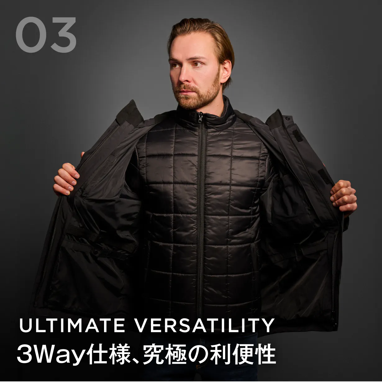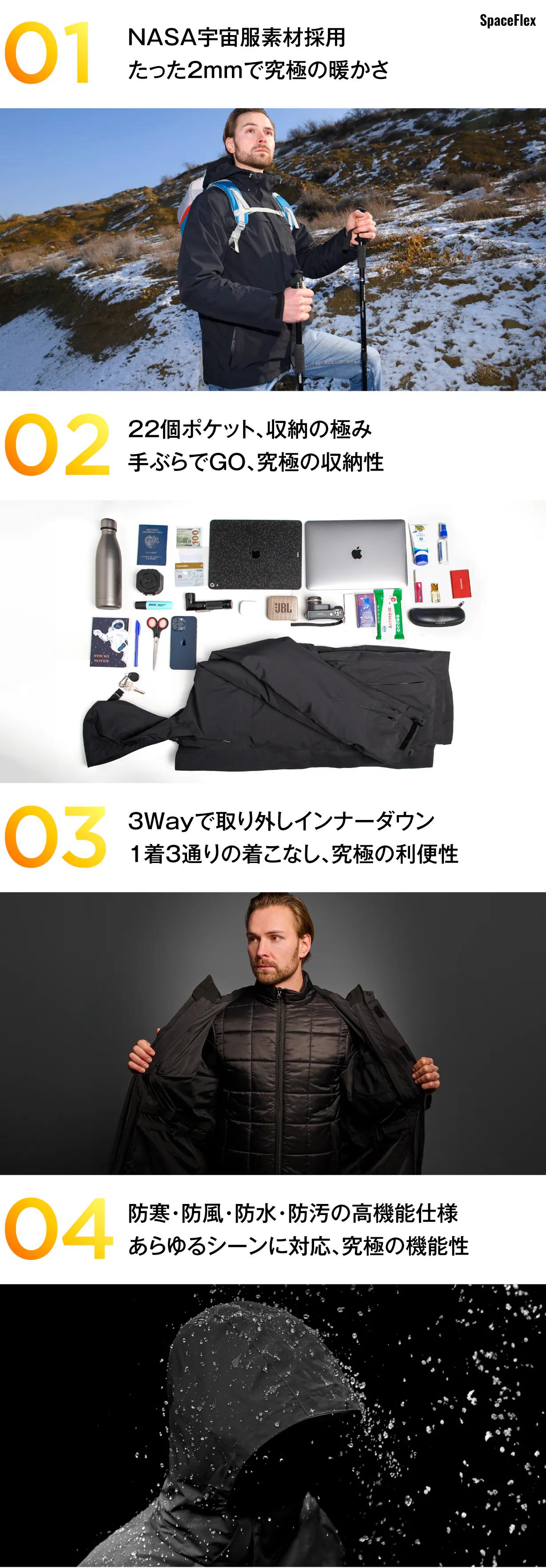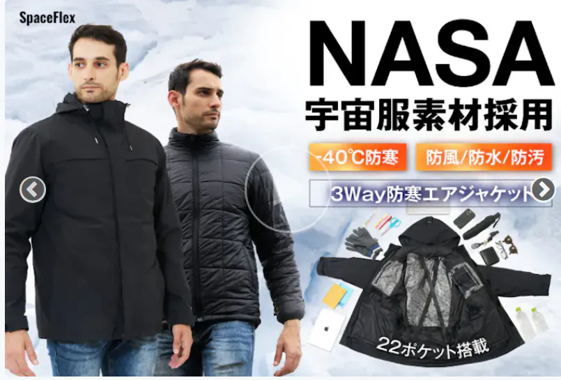 3IN1エアロゲルジャケット「SpaceFlex」(スペースフレックス)は宇宙服素材を惜しまなく採用し、高機能性・収納性にも優れた究極の1着で、寒い冬だけでなく、春秋にもお使い頂けます。