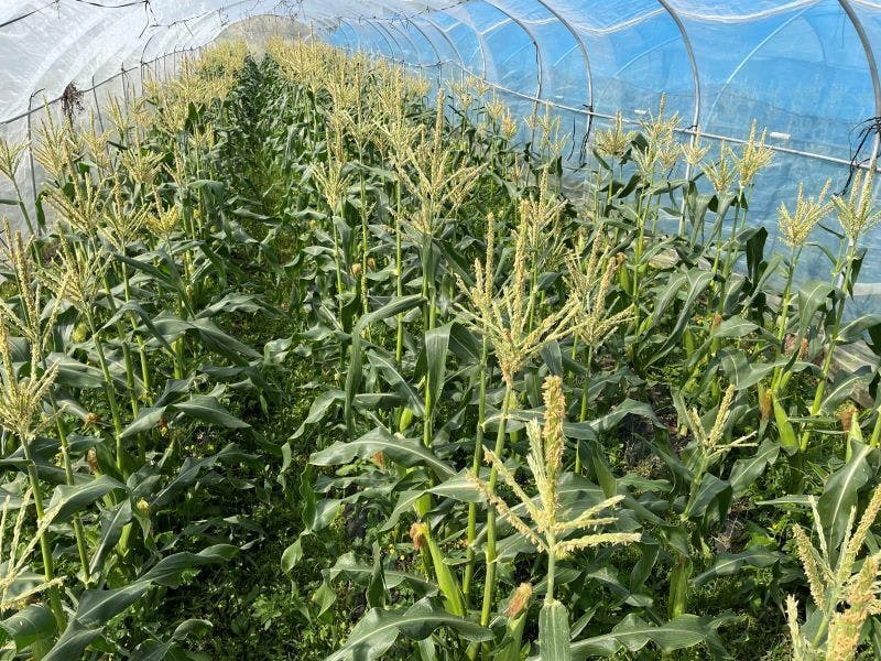農園では、ネットを張った施設栽培と露地栽培の両方でとうもろこしの栽培を行っていますが、まずはこちらの施設栽培トウモロコシから収穫を始められそうな様子です。