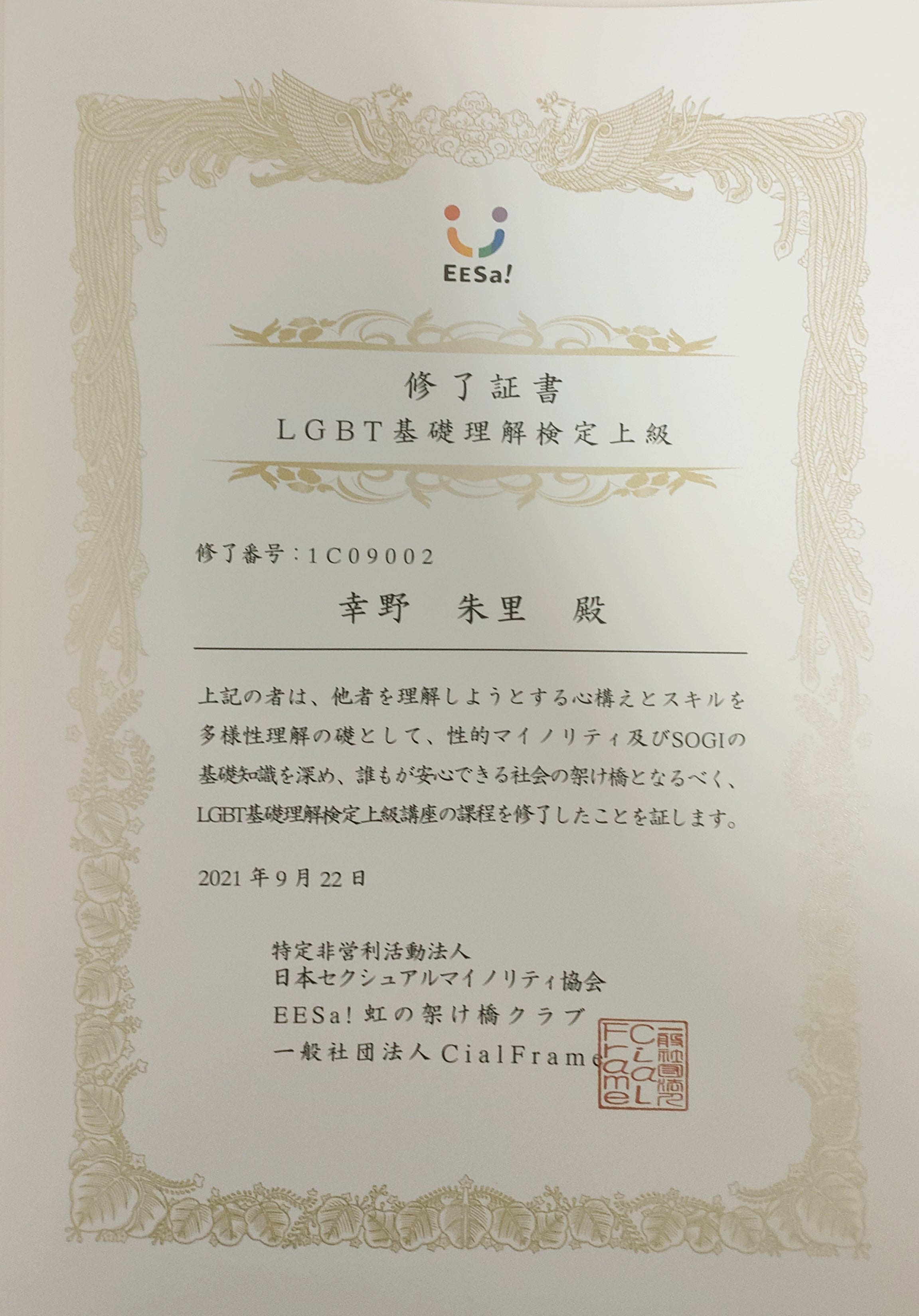 【LGBT基礎理解検定上級資格】を取得。