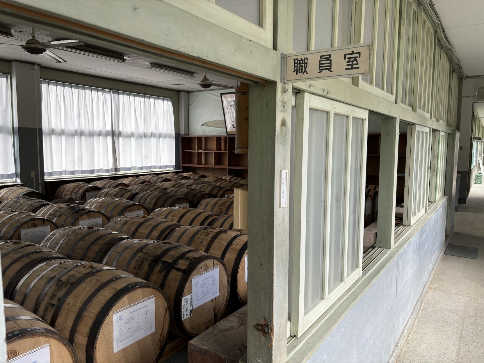 皆様、いつもご支援ご声援ありがとうございます。菱田蒸溜所の高屋です。本日は田之浦エイジングセラーの最新情報をお届けします。現在、体育館を貯蔵庫として改修後貯蔵熟成を進めておりますが、並行して校舎の一部でも貯蔵を開始しました。耐荷重の問題があり、床面がコンクリになっている部屋から順に置いていきます。「職員室」の札が何とも味わい深いですね。今は無造作に樽が置かれておりますが、今回のクラウドファンディングで集まったご支援を元に改修を行い貯蔵設備を強化していきます。どんな形で進化していくのか、ぜひ楽しみにしていてくださいね。チャレンジ期間もいよいよ大詰め!残り3日間で田之浦の今をまとめてお届けさせて頂こうと思いますので、どうぞ宜しくお願いいたします!