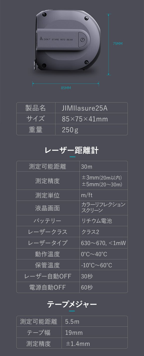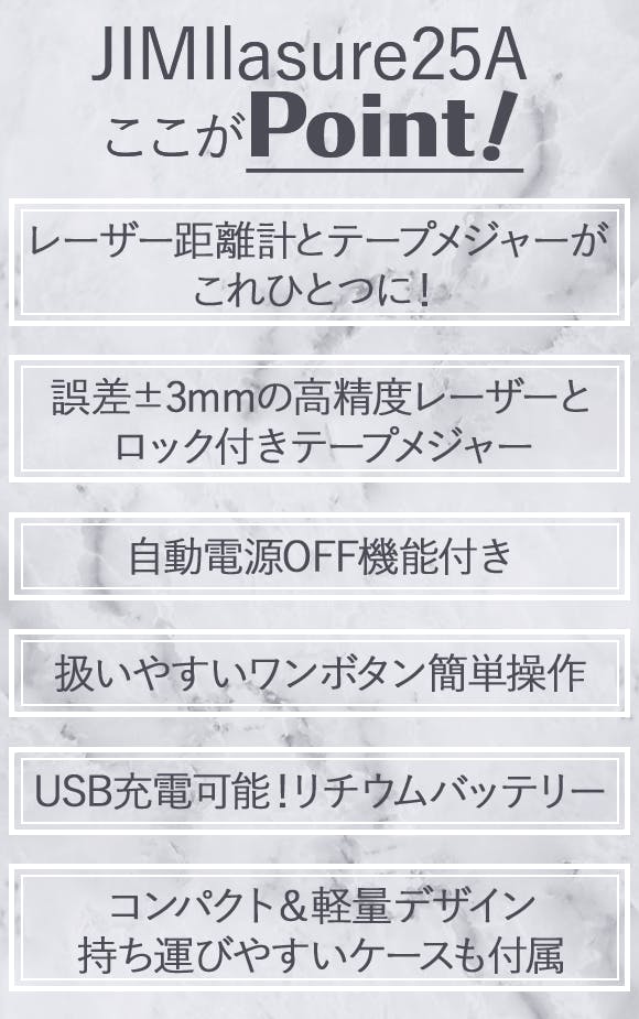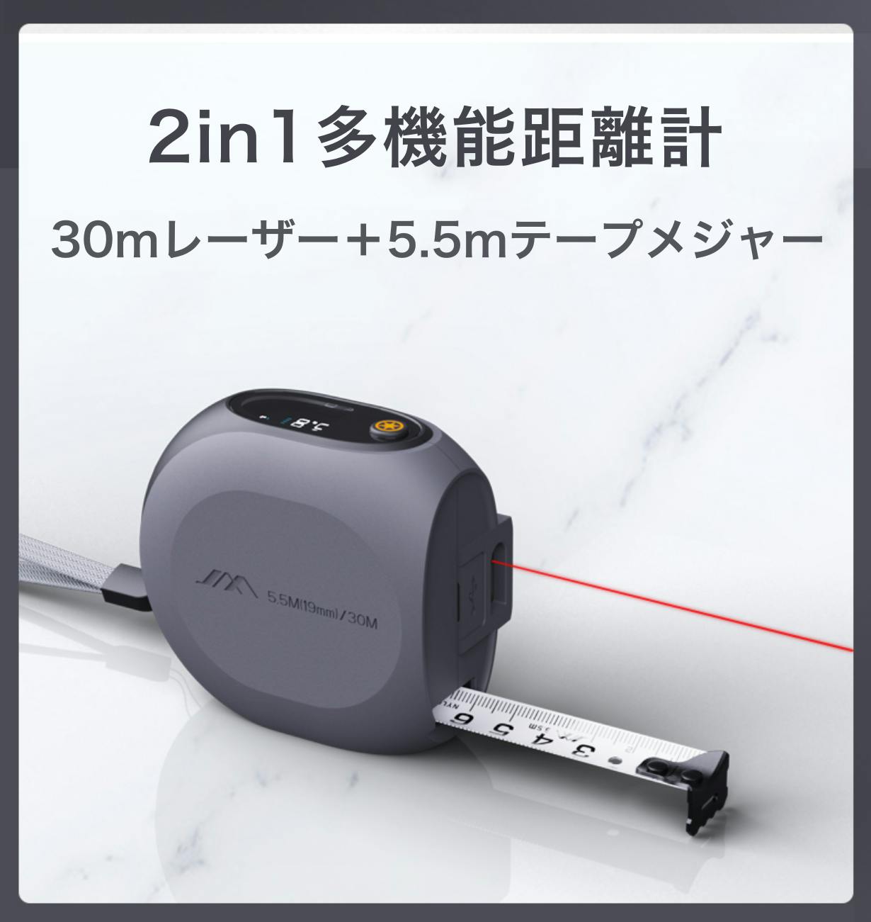 今回ご紹介する商品は、レーザー距離計とテープメジャーが一体になった万能距離計測器JIMIlasure25A。