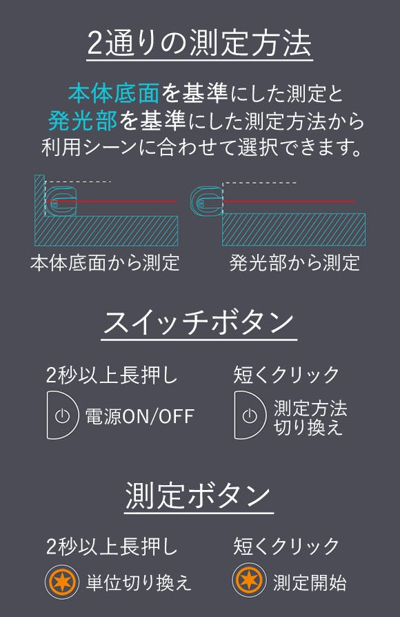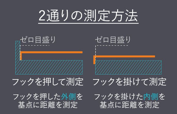 これひとつにレーザー距離計とテープメジャーがどっちも入っているので、色んな測定方式を選べて様々な用途に対応できます。