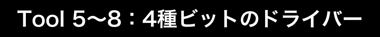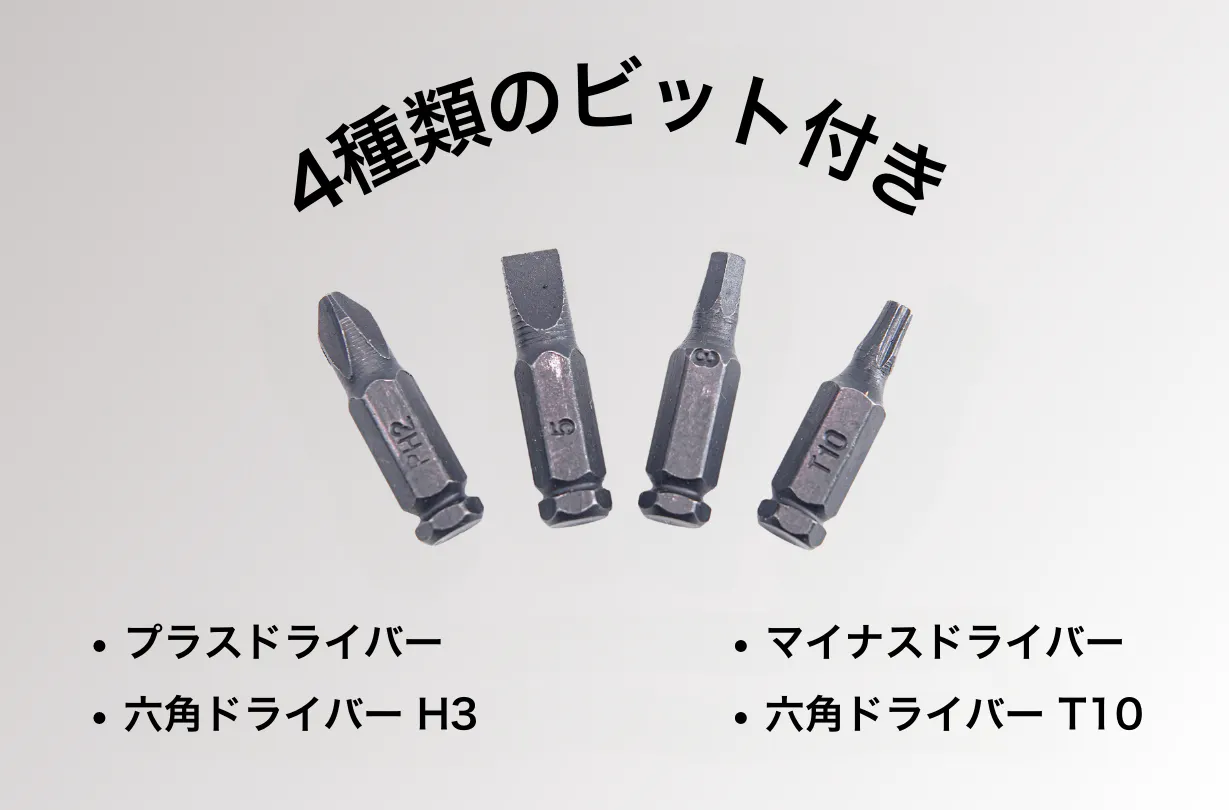日常のDIYによく使うベーシックなビットを4種類付属!これひとつで効率よく作業可能です。