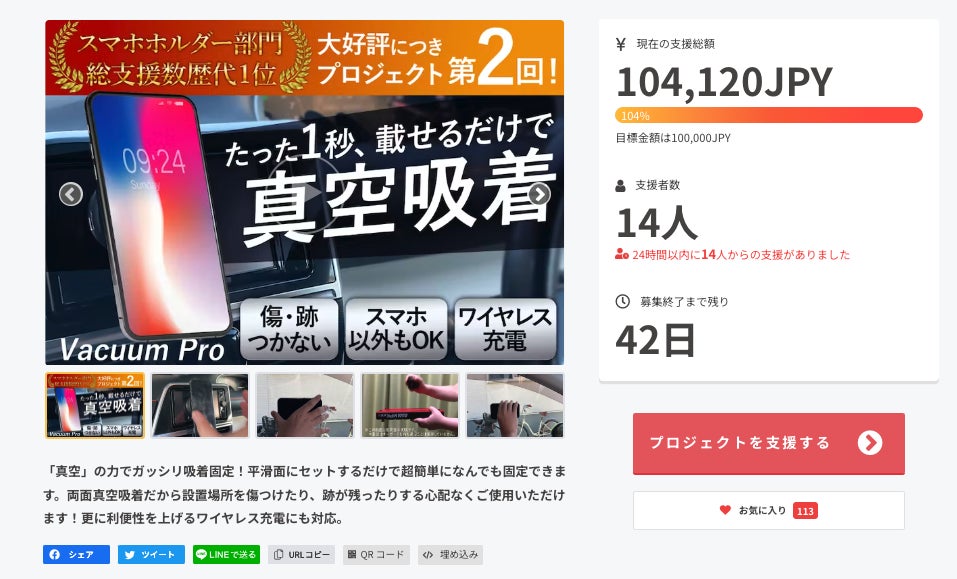 この度は「1秒でガッシリ自動固定!ワイヤレス充電対応の真空吸着式スマホホルダー【VACUUM PRO】」に支援頂き誠にありがとうございます!