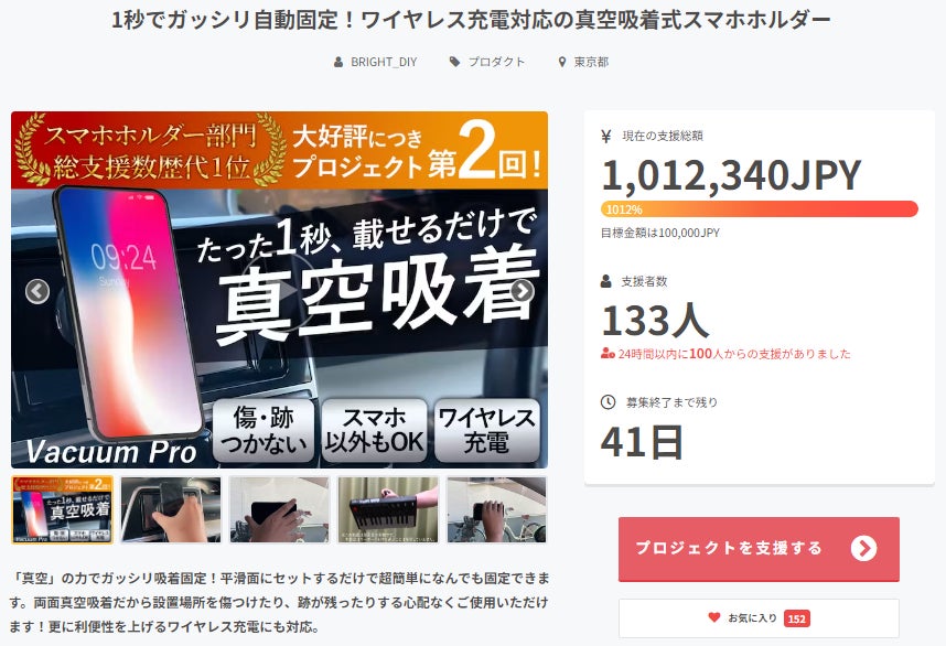 この度は「1秒でガッシリ自動固定!ワイヤレス充電対応の真空吸着式スマホホルダー【VACUUM PRO】」に支援頂き誠にありがとうございます!