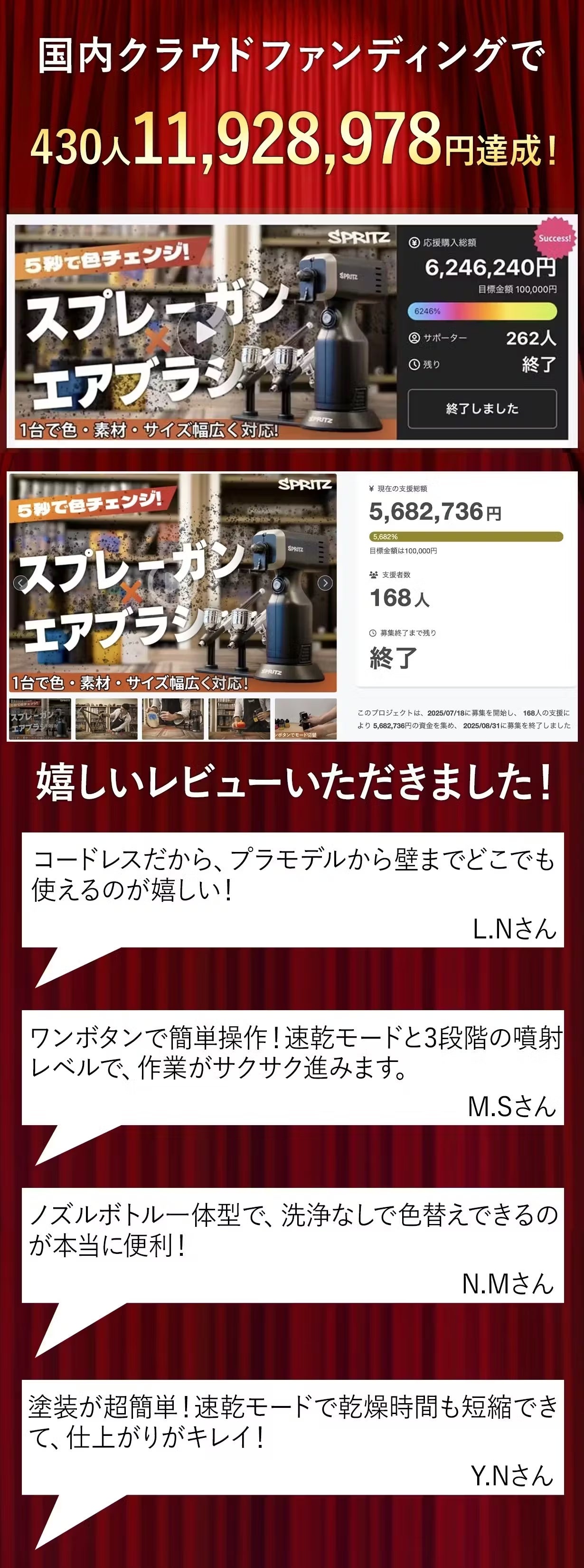 今回は皆さまに「ノズルボトル一体型で色替えが簡単!ワンボタン操作で噴射レベル3段階&速乾モードで乾燥時間短縮。コードレスで小物から大物まで対応可能、使いやすさ抜群」プロジェクトを紹介させて頂きます。