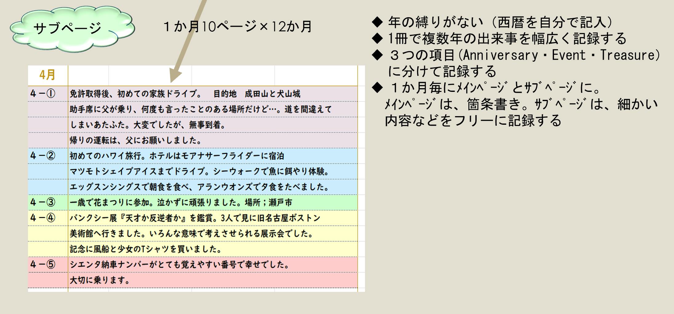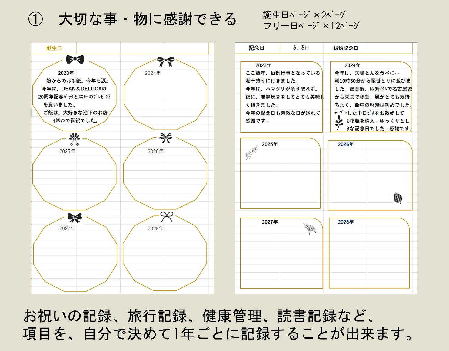 順番に記録すことにより、〇年〇月〇日に何があったとわかるため、自分史年表として記録が残る。Anniversary・Event・Treasureと3区分しているので、項目ごとに記録ができ振り返りがとても分かりやすくなる。年ごとの、TODOリストも活用することで、備忘録としても大活躍。