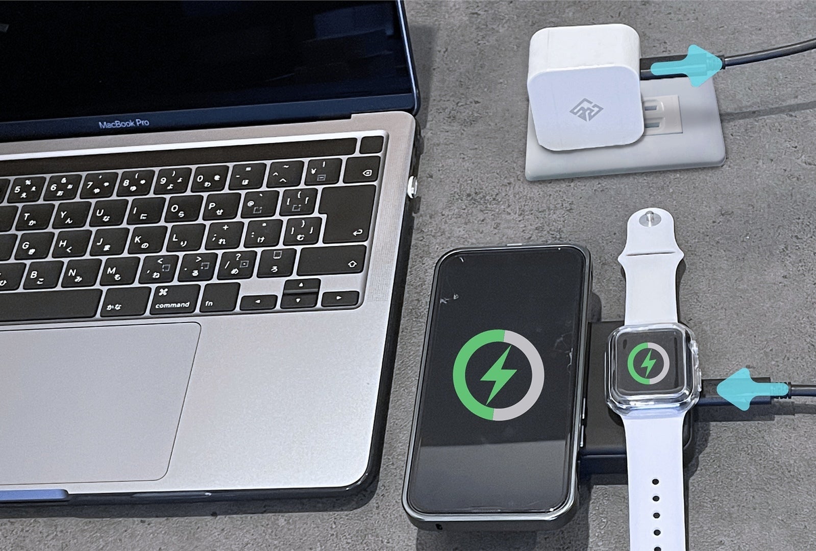 コンセントが1つでも、バッテリーとデバイスを同時に充電が可能です。