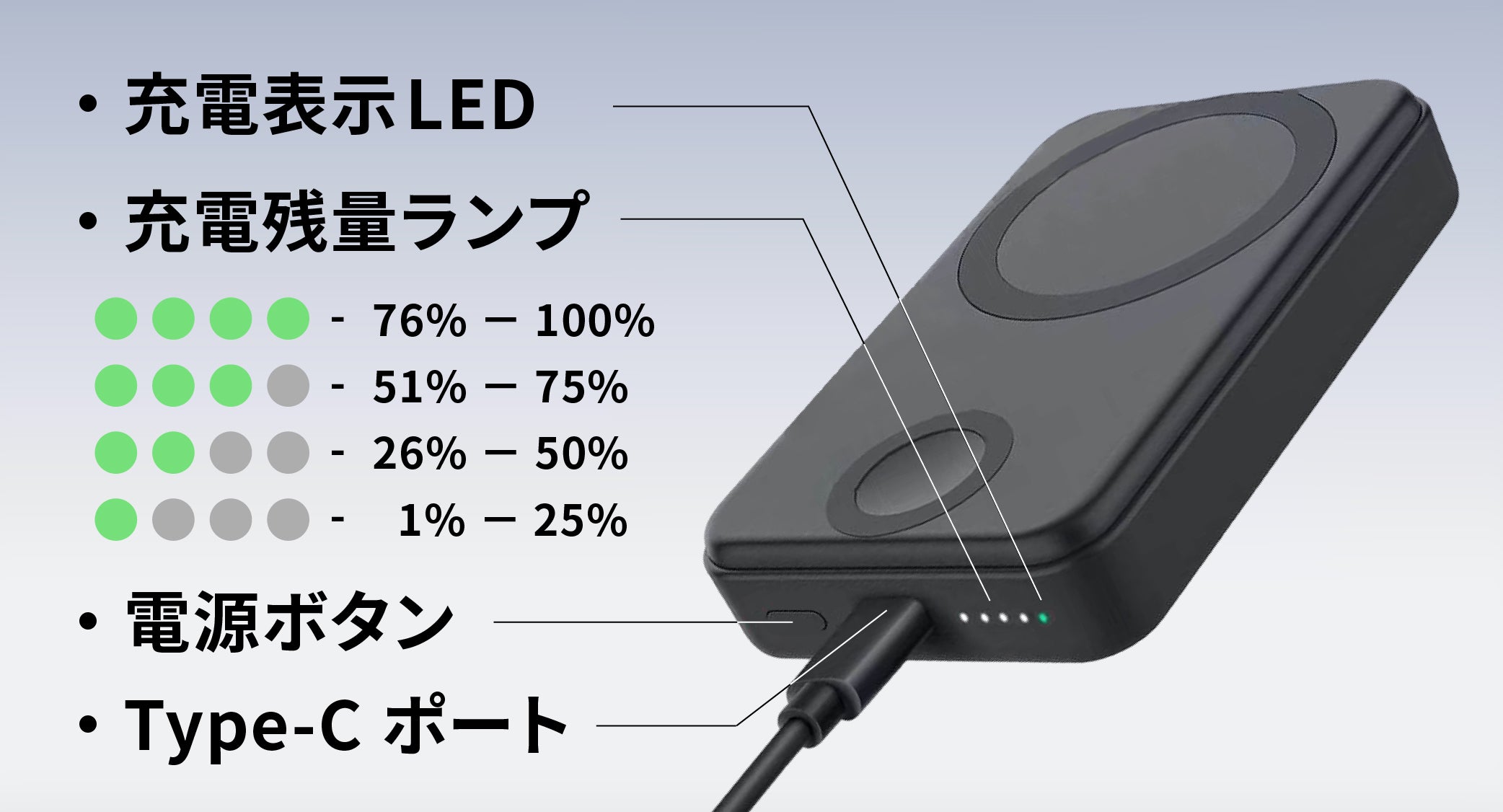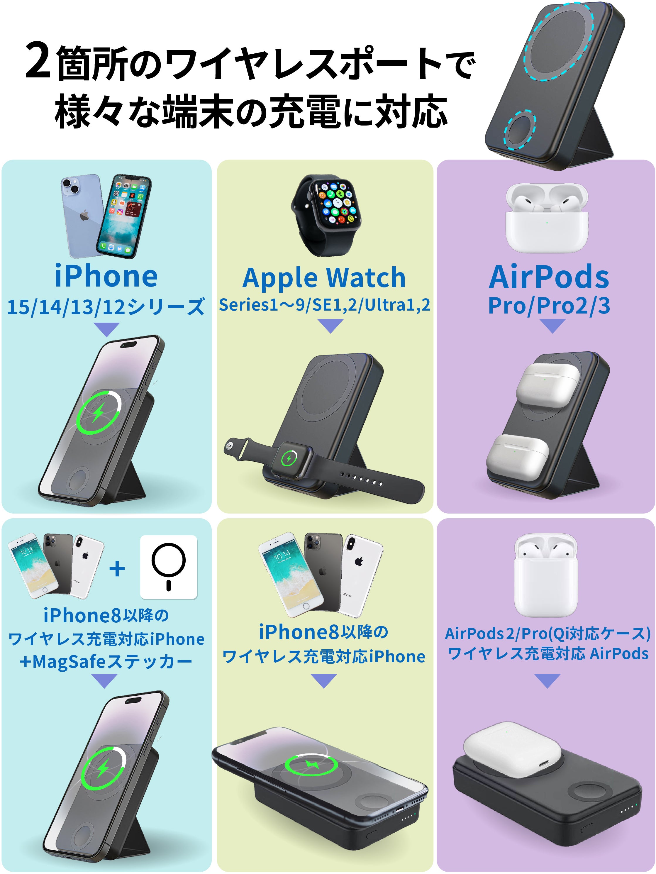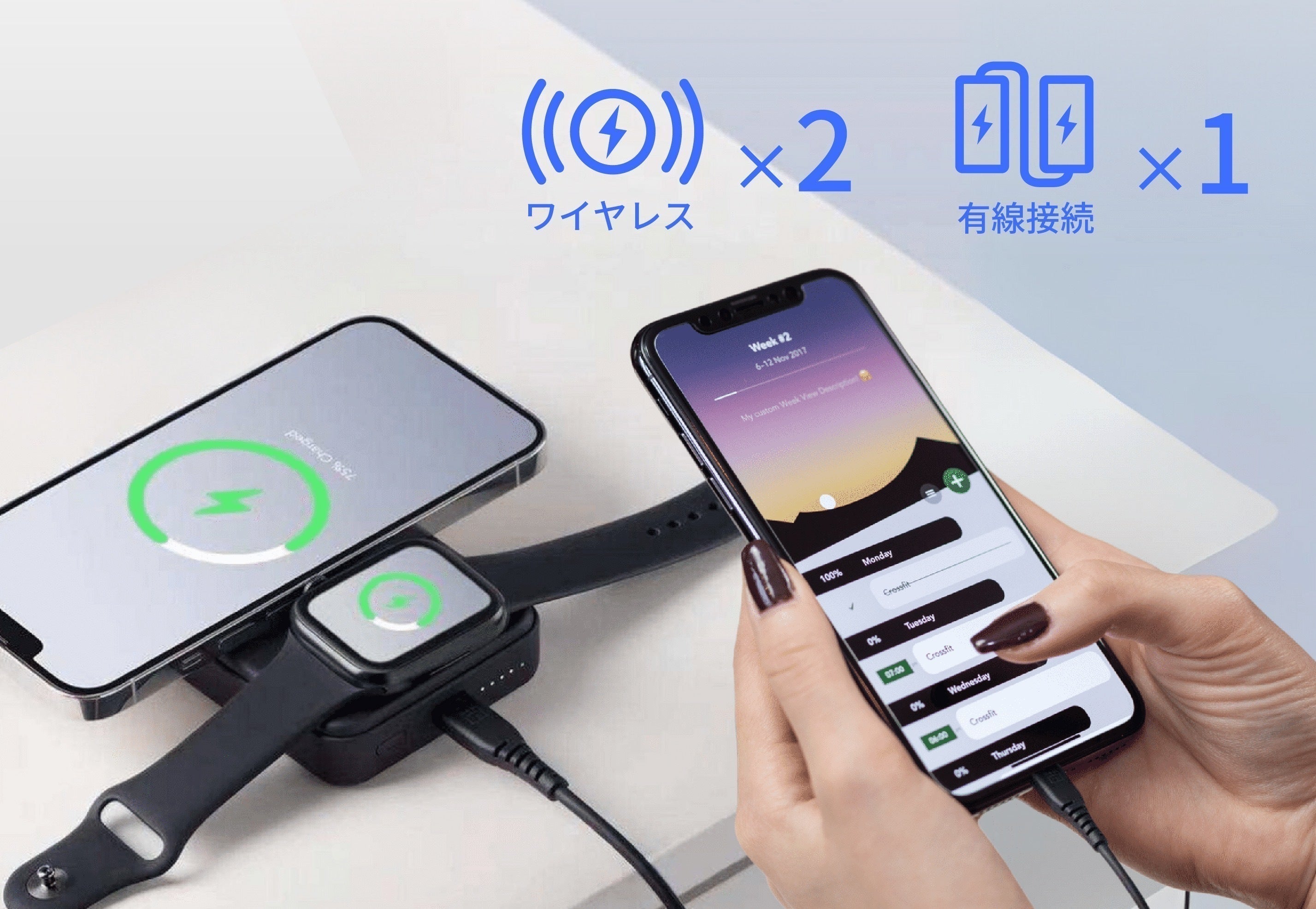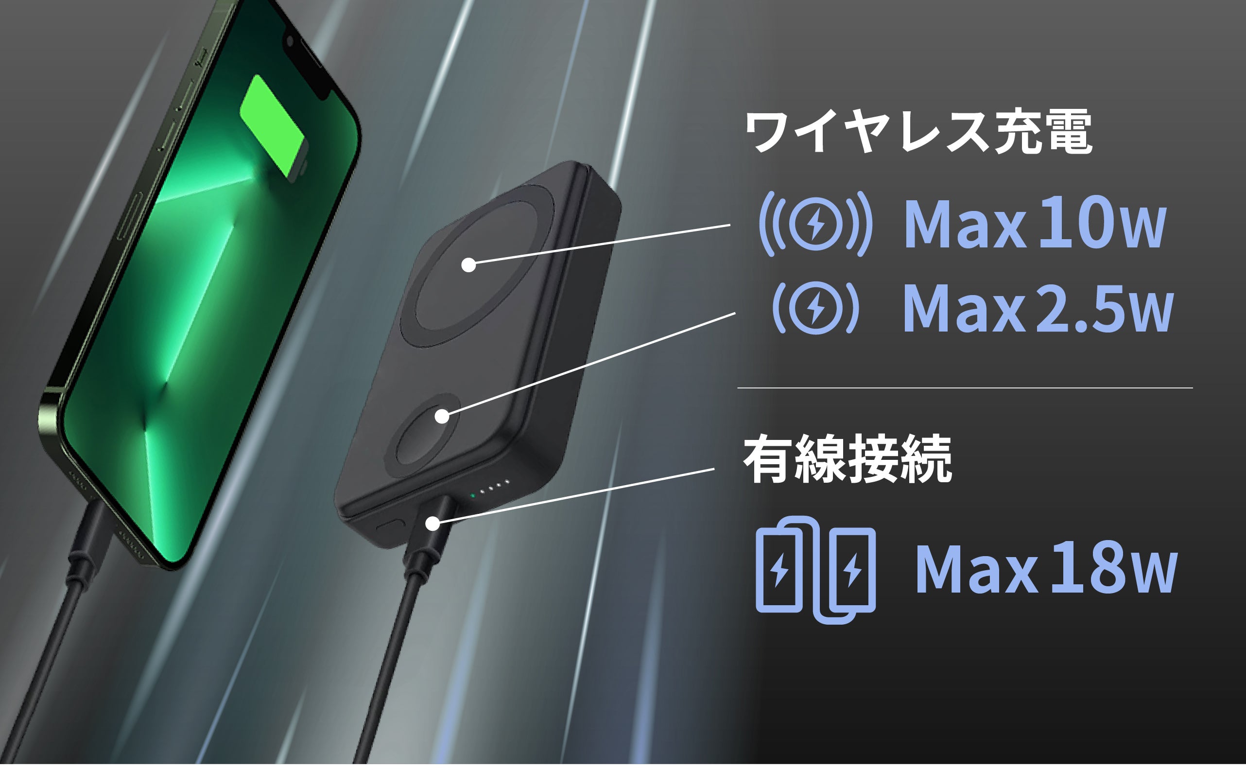 ワイヤレス充電に対応していない端末への充電や、複数のデバイスでのバッテリーのシェアにも役立ちます。