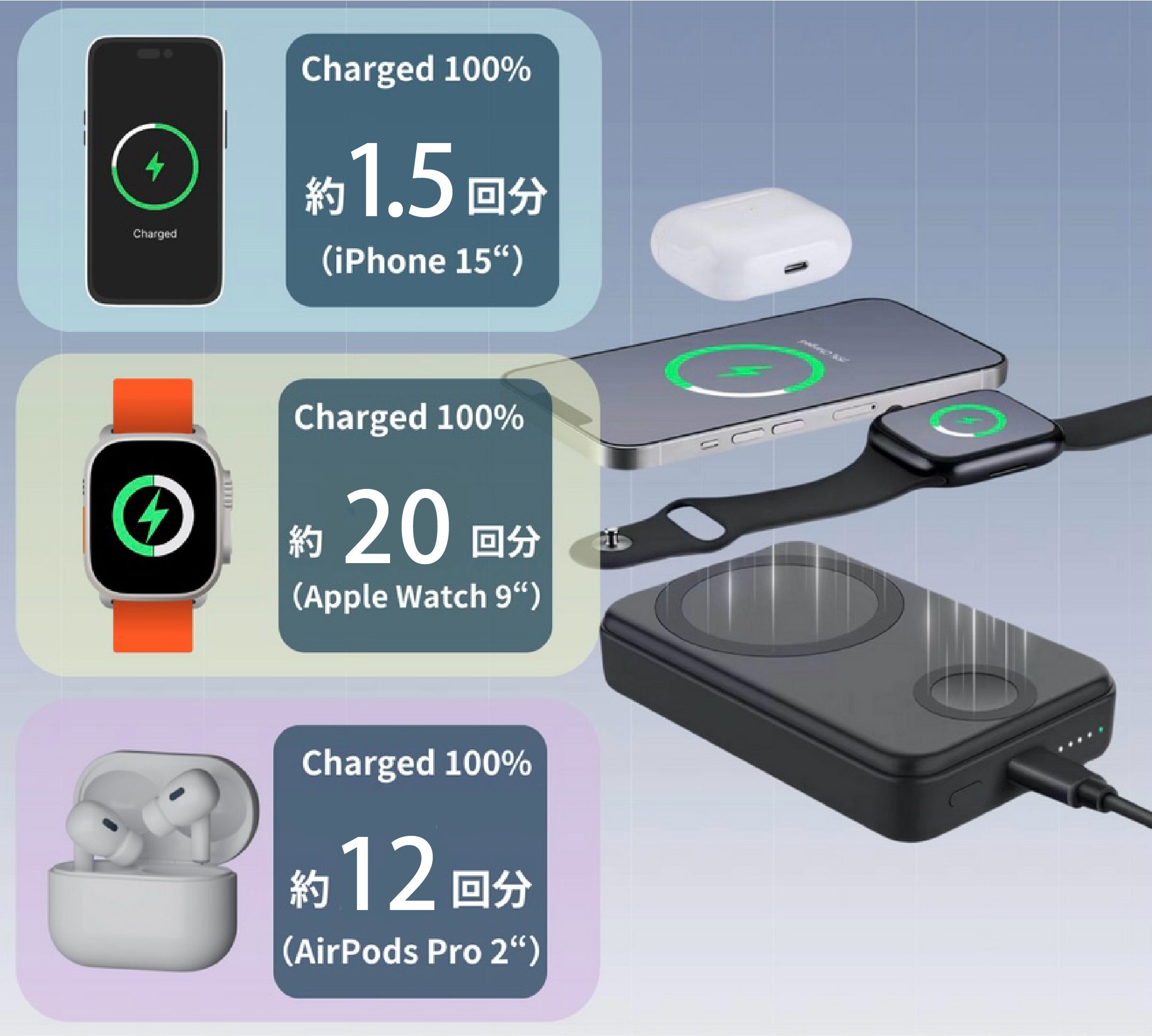 iPhone13を約1.5回、Apple Watch(第9世代)を約20回、AirPods Pro 2を約12回と、日常利用にも十分に対応が可能です。