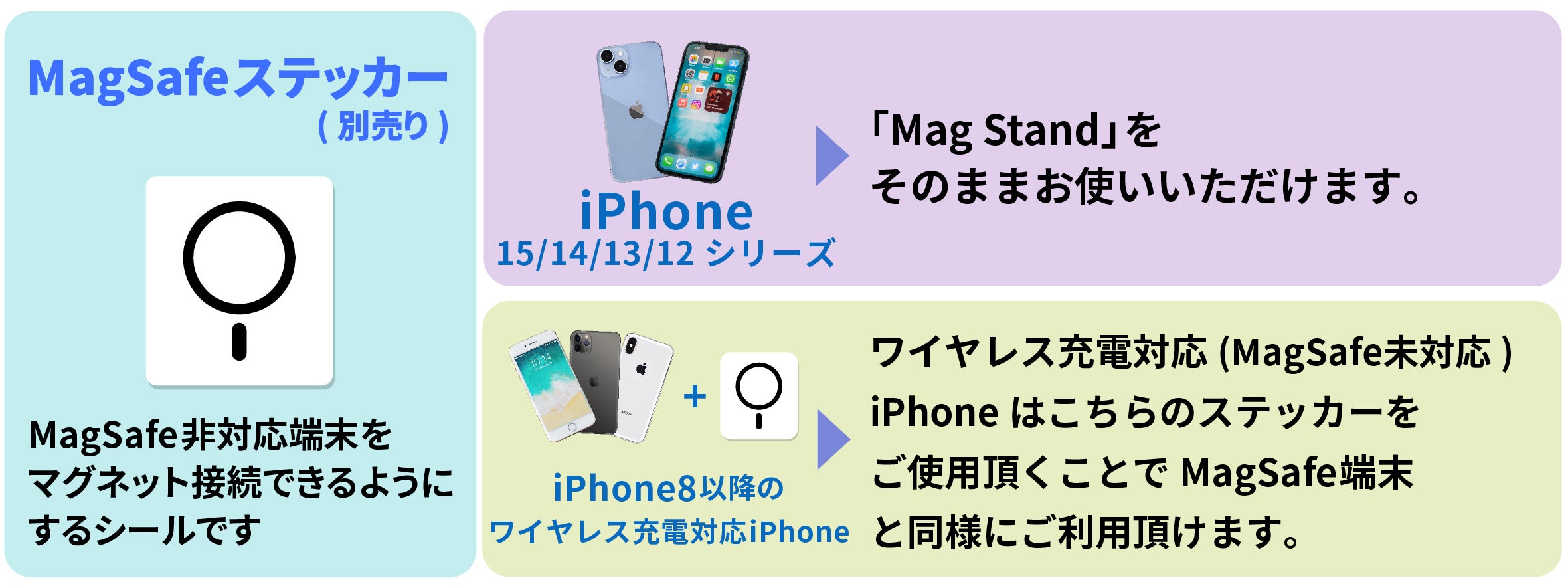MagSafe対応端末または、MagSafe対応ステッカー等をご使用の場合は強力なマグネット接続をご使用いただけます。