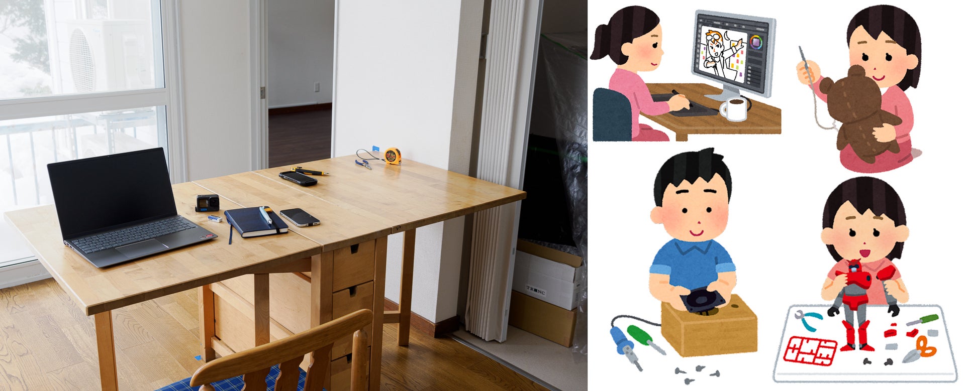 部屋としてのご利用が無い時はデジタル工作機がある部屋のテーブルと共に「軽作業スペース」としてご利用になれます。