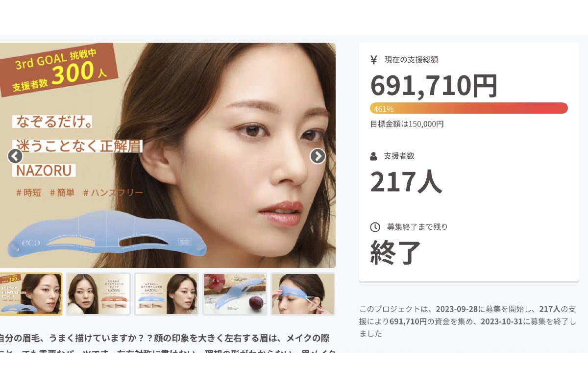 そこで前回9月には、ecaからのお悩み解決コスメ第一弾として、メイクの中でも一番の悩みであり、お顔の印象の8割を占めると言われている「眉毛」に着目し、テクニックなしで誰でも簡単に正解眉のガイドが描ける眉テンプレート「NAZORU(ナゾル)」を開発し、本クラウドファンディングCAMPFIREにて先行予約をしました。