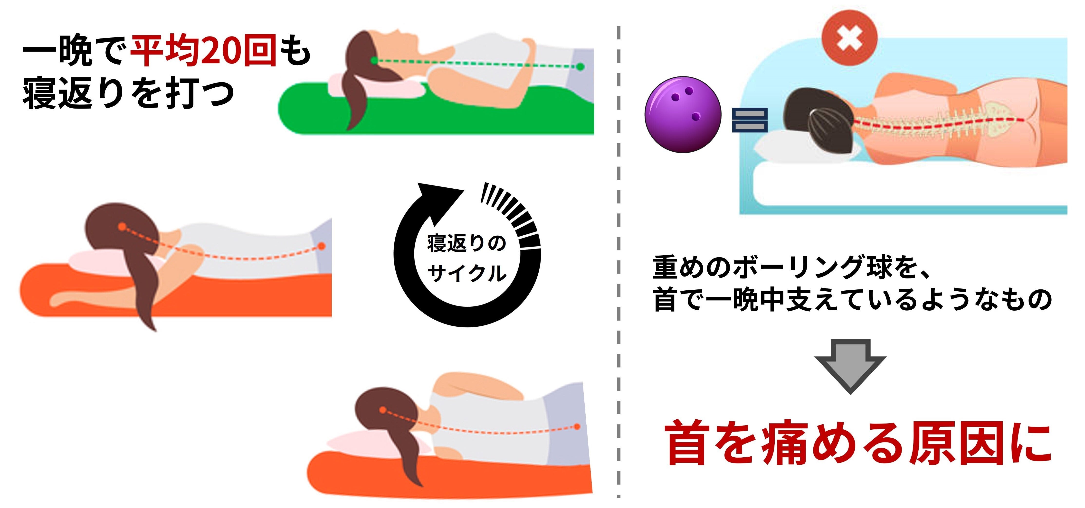人は睡眠中の体圧分散や背中の体温調整のため一晩で平均20回も寝返りをしますが、実はそのたびに頭の高さが変わり首や肩の筋肉に負担がかかり続けます。