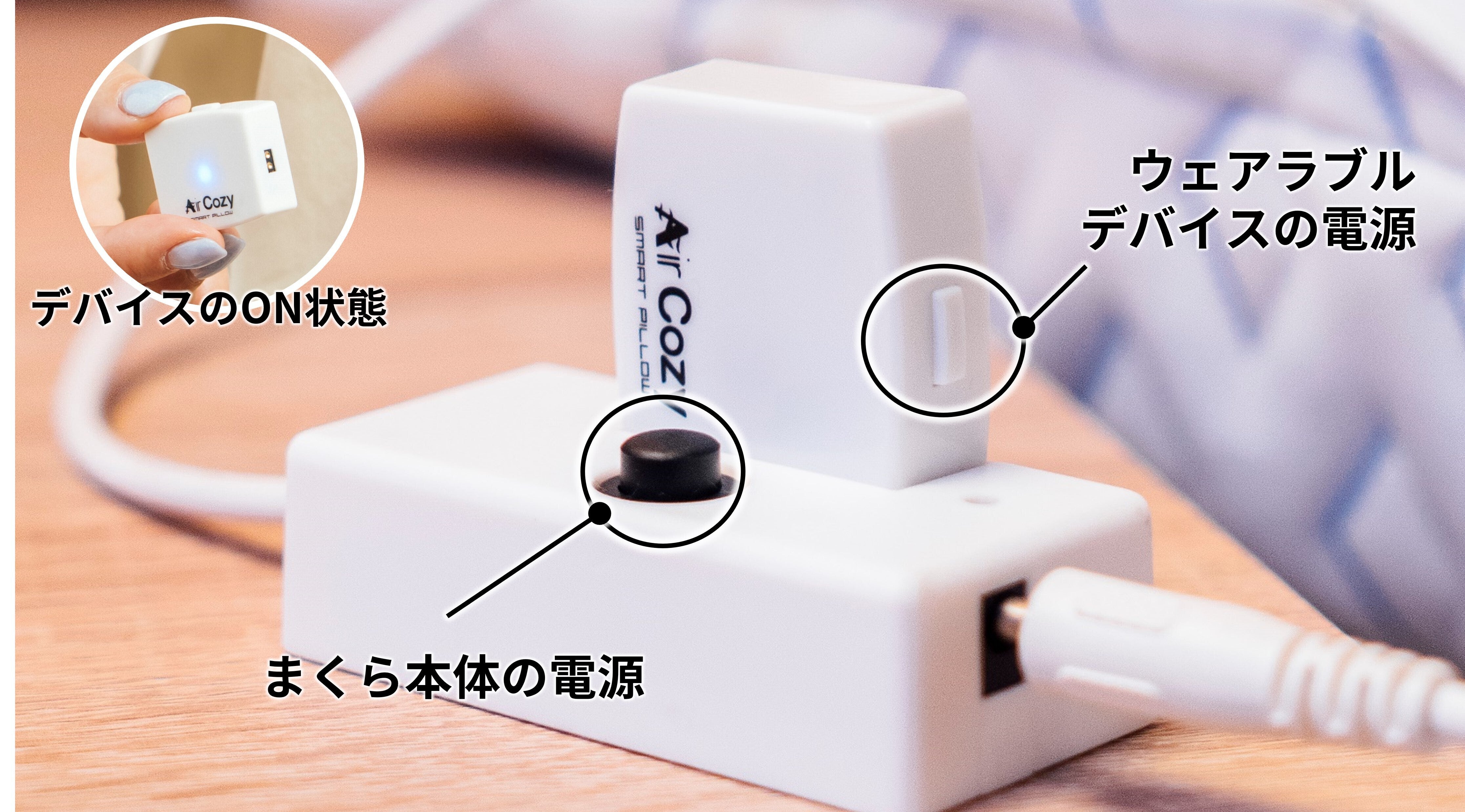 ② まくら本体とウェアラブルデバイスの電源をそれぞれONにします。(デバイスはボタンを長押しするとONになり、青色に点灯します)