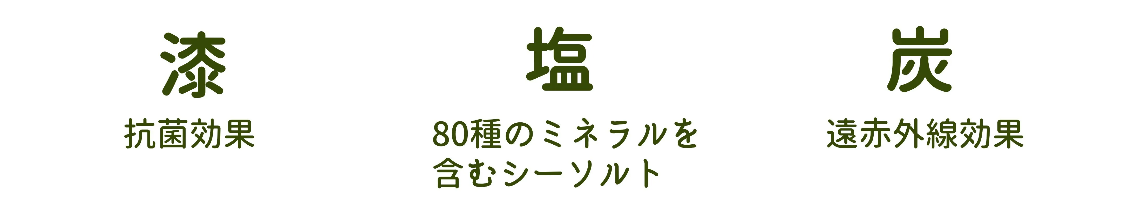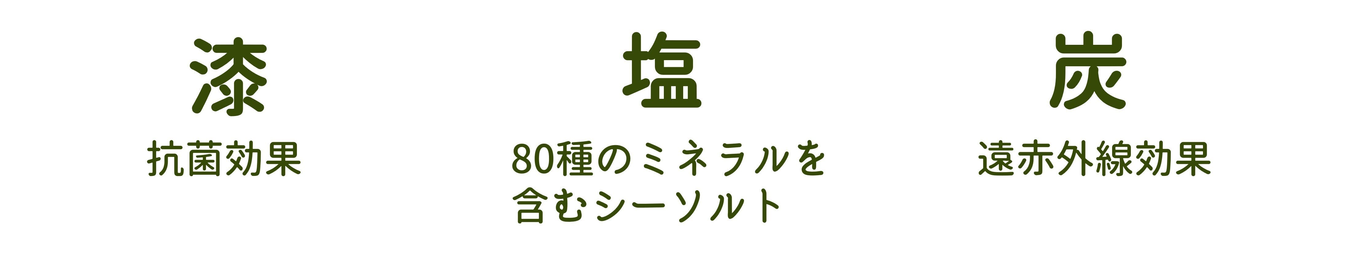 漆には抗菌効果が確認されています。塩には80種のミネラルを含む、体に優しいシーソルトを使用。炭には遠赤外線放射の効果があり、温めた際に目をじわっと温めてくれることが期待できます。