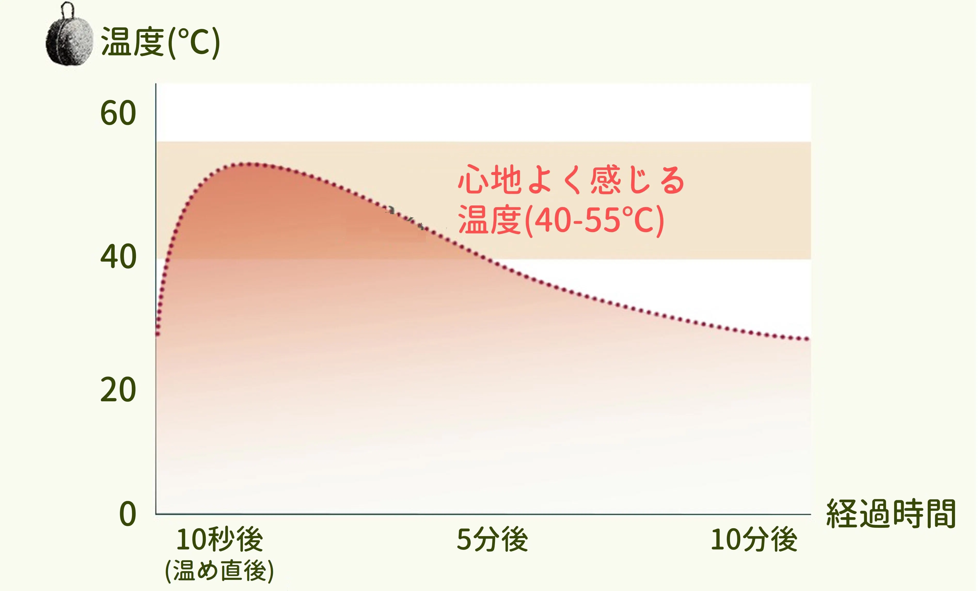 電子レンジから出すと、徐々に温度は下がり5分で約40℃、10分で室温に近い温度まで戻ります。
