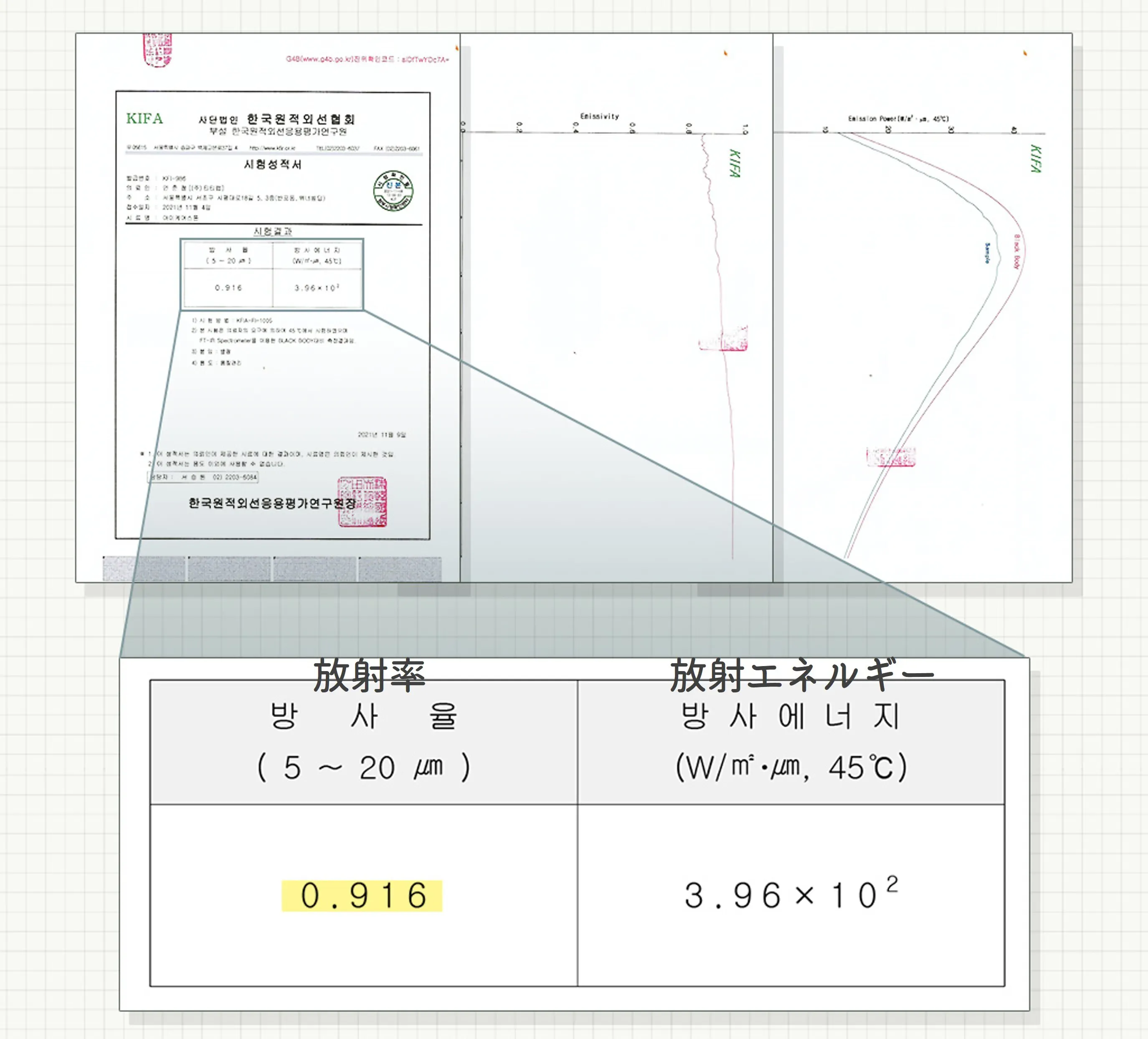 遠赤外線の放射試験では、45℃まで温めると放射率91.6%という高効率で遠赤外線が放射されることが確認されました。