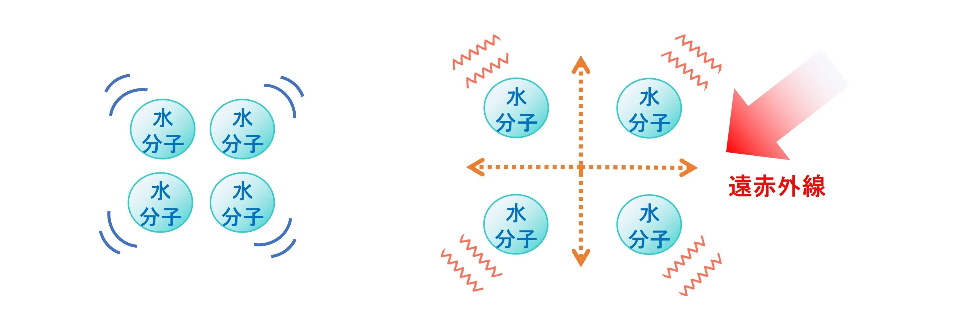 遠赤外線は、水分子やたんぱく質に当たると振動を起こします。