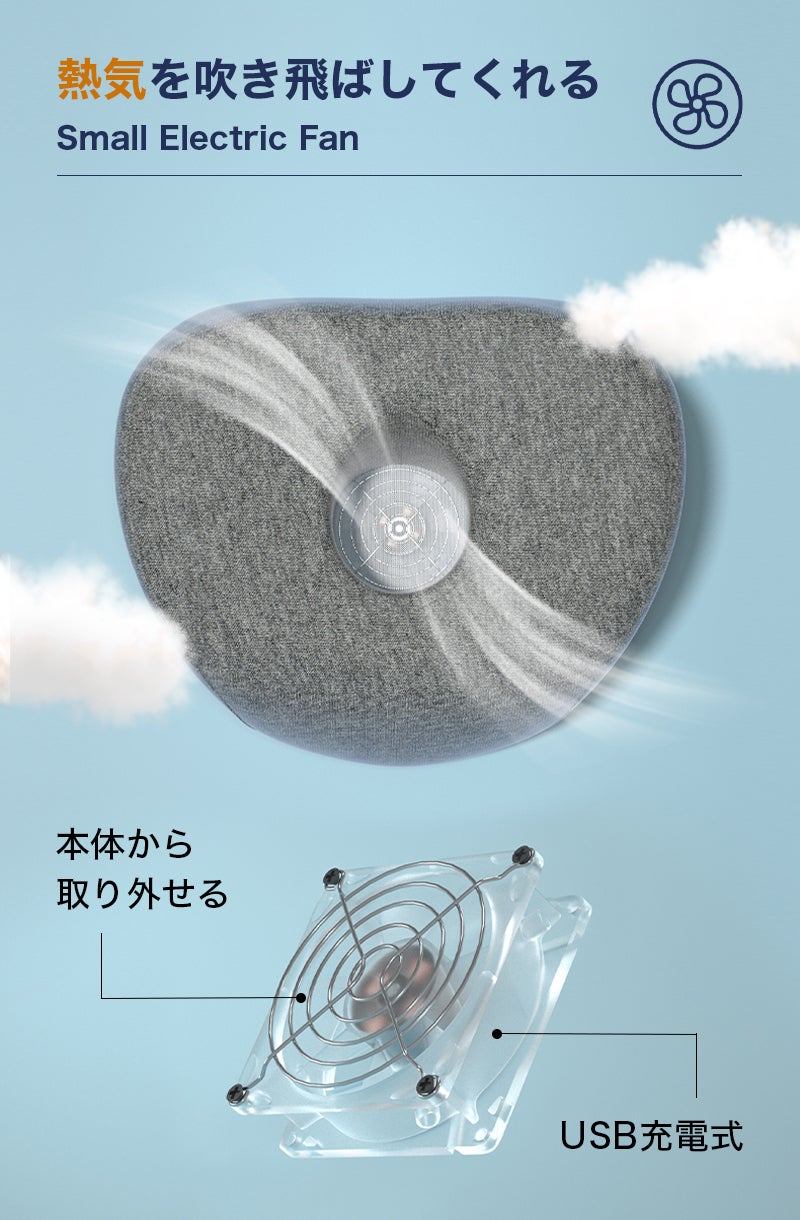 静音性に優れたUSB充電式の小型扇風機が組み込まれており、自然に近い柔らかな風を届けます。