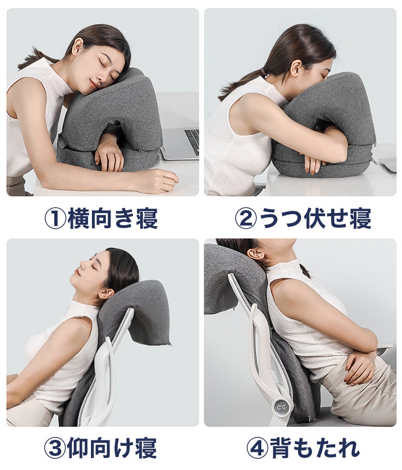 デスクにうつ伏せになったり、椅子の背もたれに体重を預けたりと、4通りの使い方ができて様々なシーンで大活躍します。