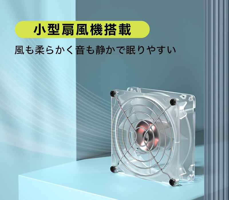 静音性に優れたUSB充電式の小型扇風機が組み込まれており、自然に近い柔らかな風を届けます。