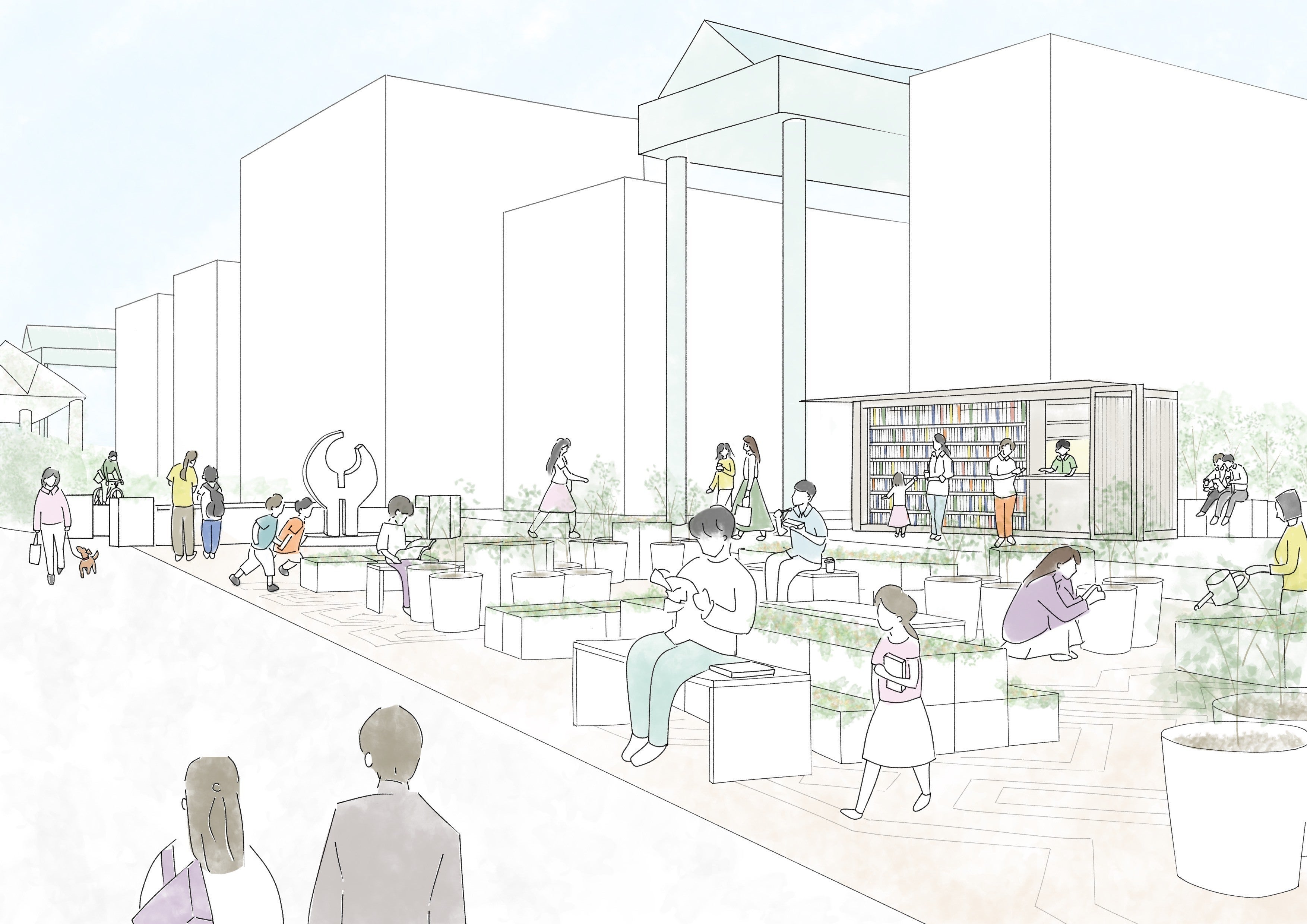 プロジェクトの実施場所は、宇都宮の中でも特に中心部であるオリオン通りに面する釜川沿いです。ここには、市民の憩いの場としてふれあい広場が整備されましたが、今はあまり活用されていません。ここと隣接のポケットパークに、ブックカフェやベンチを設えることで、宇都宮のまちなかに賑わいを取り戻します。これをきっかけに、ふれあい広場周辺の空き家、空きテナント、低未利用地等との一体的な利活用を目指します。