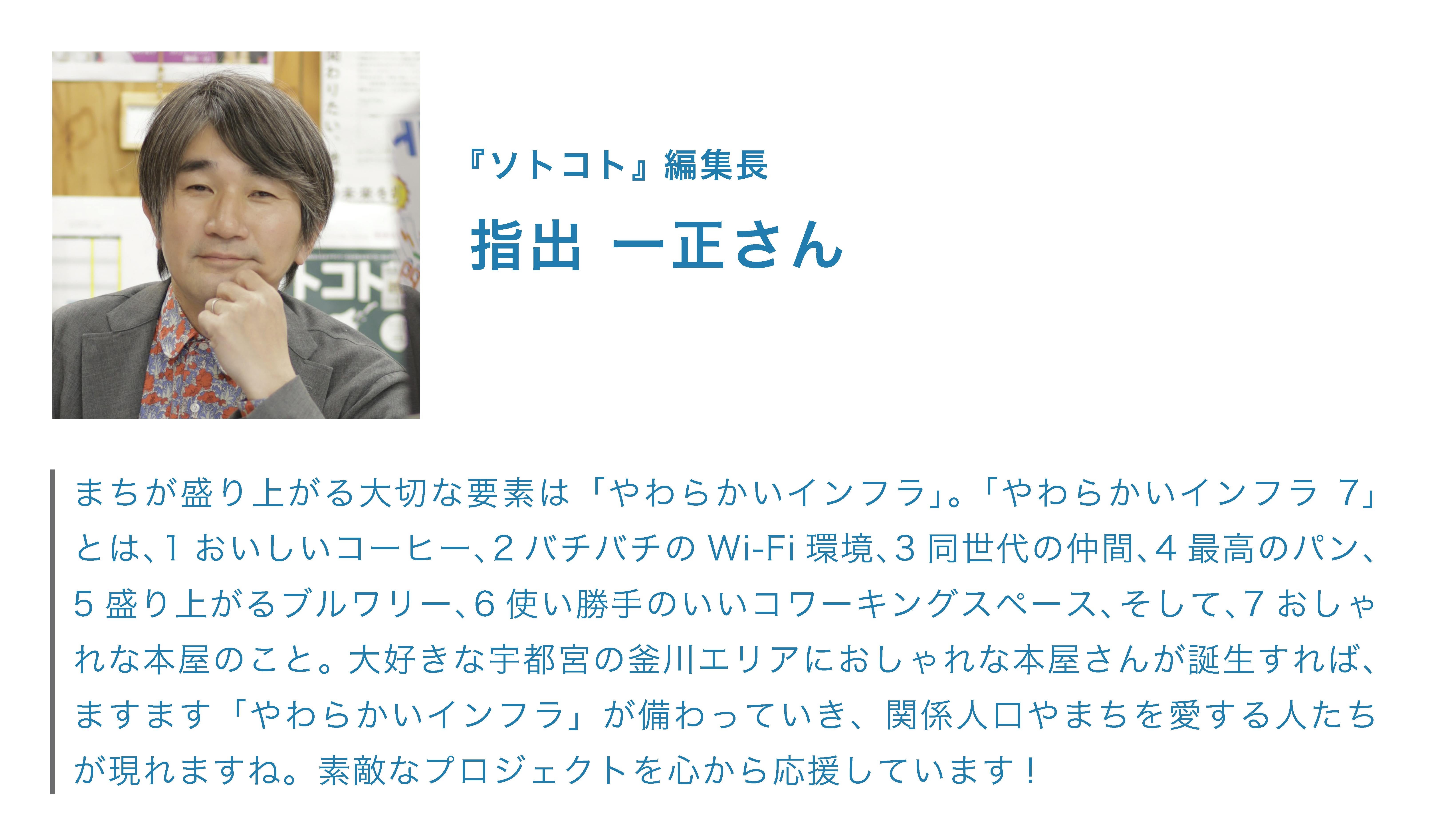 それでも開きたい。本をまんなかに置いて色々なことが生まれ、様々なことが起きる場をみんなでつくりたい。見慣れたいつもの釜川の風景を、「ちょっと誇れる」新たな釜川らしさをもったまちなみに。