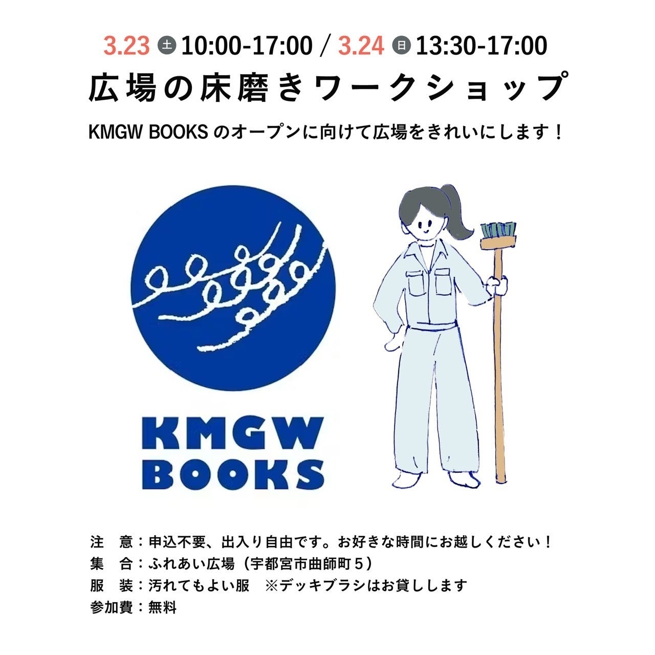 KMGW BOOKSのオープンに向けて、ふれあい広場の床をデッキブラシできれいにします!