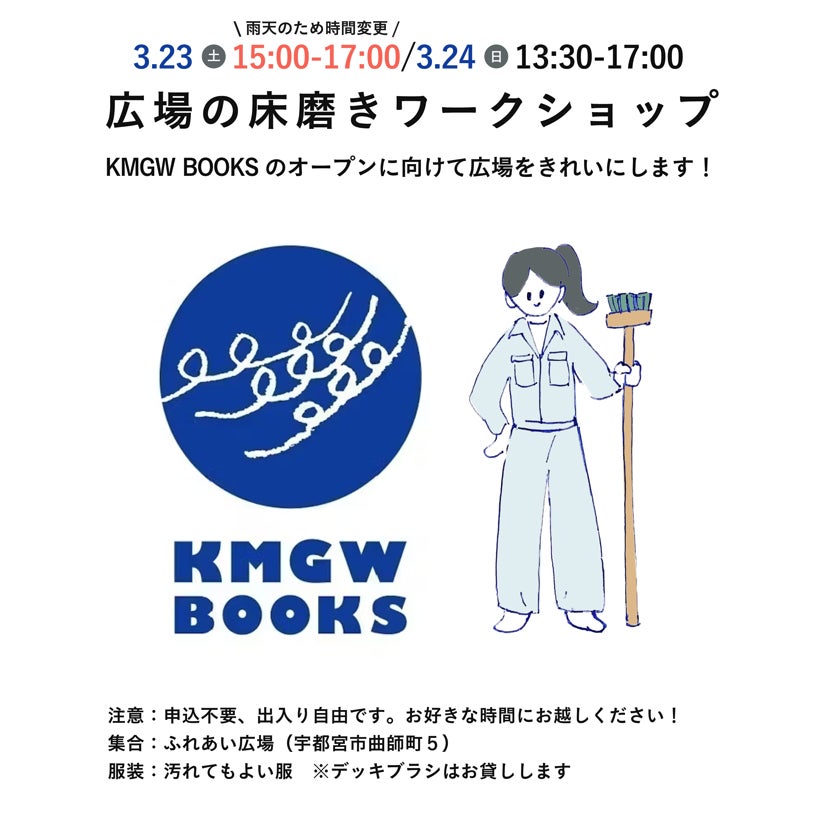 KMGW BOOKSのオープンに向けて、ふれあい広場の床をデッキブラシできれいにします!申込不要、出入り自由ですので、お気軽にご参加ください◎日 時:3/23(土) 10:00-17:00 / 24(日) 13:30-17:00集 合:ふれあい広場(宇都宮市曲師5)服 装:汚れてもよい服 ※デッキブラシはお貸しします参加費:無料主 催:カマクリ協議会、一般社団法人釜川から育む会問合先:kama9ri@gmail.com(釜川から育む会)※荒天中止(中止の場合はSNSで告知します)※作業状況によって早めに終わることがあります