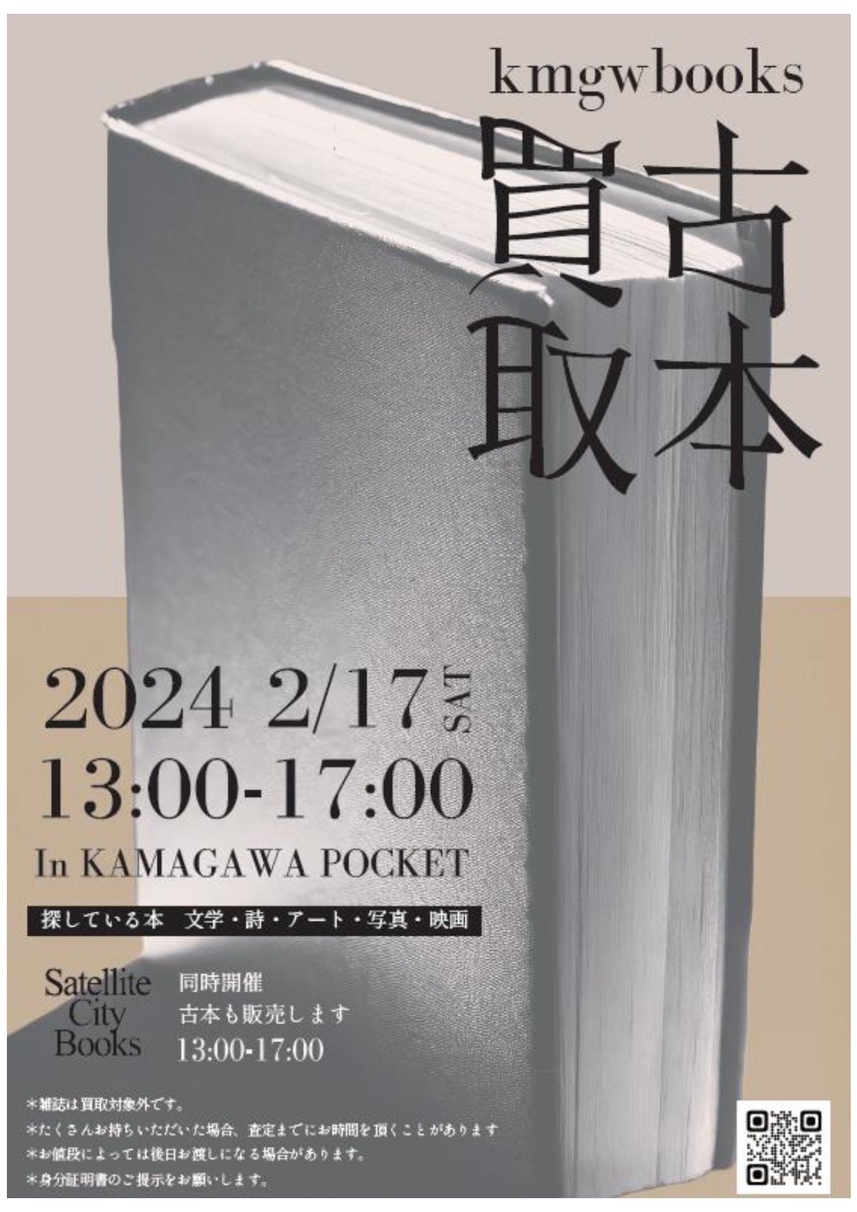 KMGW BOOKSオープンに向け、2/17(土)13時からKAMAGAWA POCKETにて古本の買取を行います。文学・詩・アート・写真集・映画・音楽等のジャンルの本を探しています!Satallite City Booksによる古本販売も開催します。ぜひお立ち寄りください◎▽Satallite City Books https://twitter.com/SATELLITECITYBS日時:2/17(土)13時~17時場所: KAMAGAWA POCKET(宇都宮市二荒町8-15)