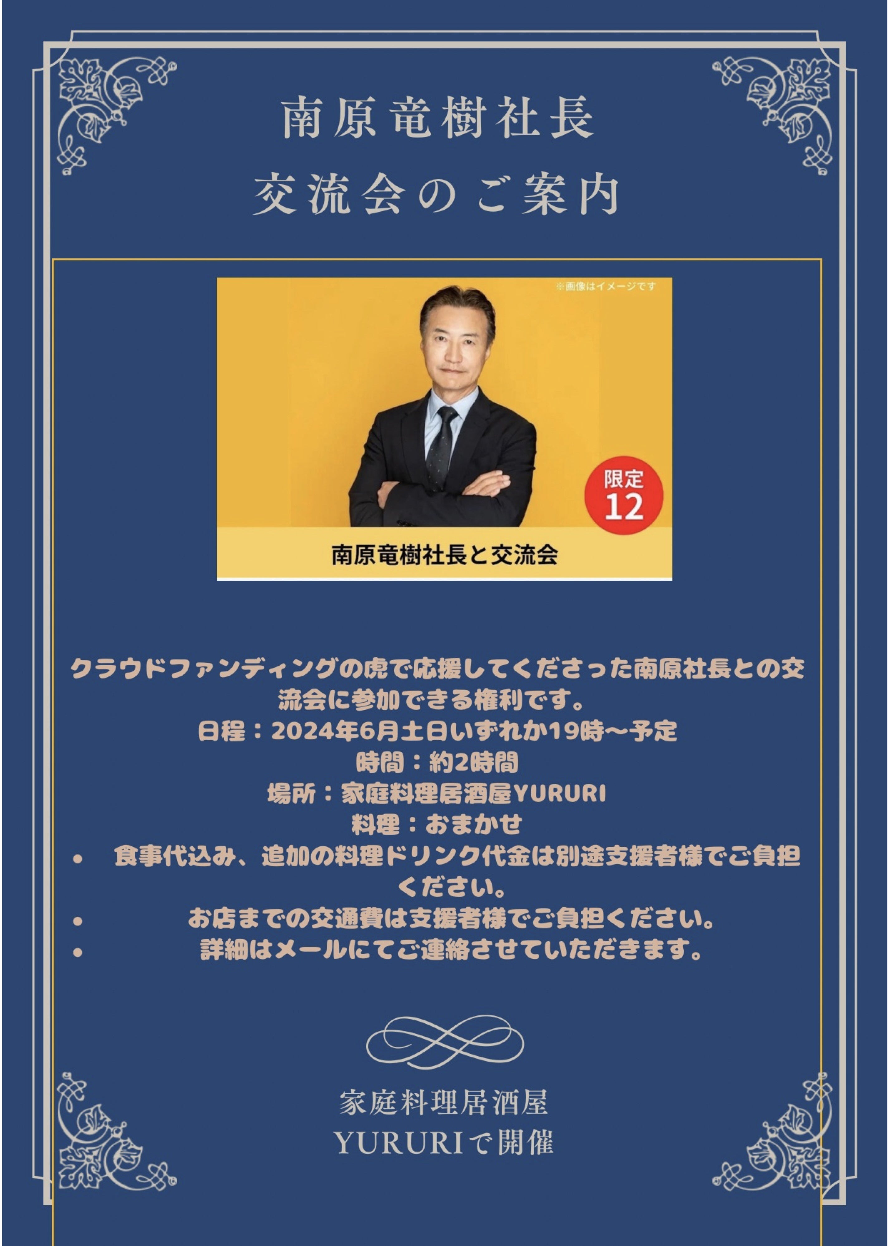 おはようございますYURURIの山下です今日はマネーの虎、令和の虎に出演されていた名物社長の1人でもある南原竜樹さんがYURURIで交流会を開いてくれるリターン(YURURI応援チケット)をご紹介します。南原さんとスバキリ商店さんの共同企画である"クラウドファンディングの虎"に出演させてもらった僕は気持ちや熱意を伝えた結果、合格者として手厚いサポートや助言をしていただきこうしてクラウドファンディングをスタートさせることが出来ました。クラウドファンディングのリターンとして南原社長は僕のお店であるYURURIにてなんと交流会を人数限定で開いていただけることになりました!※付属の料理内容はクラウドファンディング専用コース【1万円】と同等の内容を提供予定ですこれは夢のような出来事なのですが僕の努力不足のためまだまだ席に空きがある状態です‥‥どうか南原社長の好意に応えるためにも満席にしたいので良かったご検討していただけると嬉しいです!また南原社長のファンの方などご紹介いただけるとめちゃ嬉しいです!!それでは今日もがんばっていきます!!
