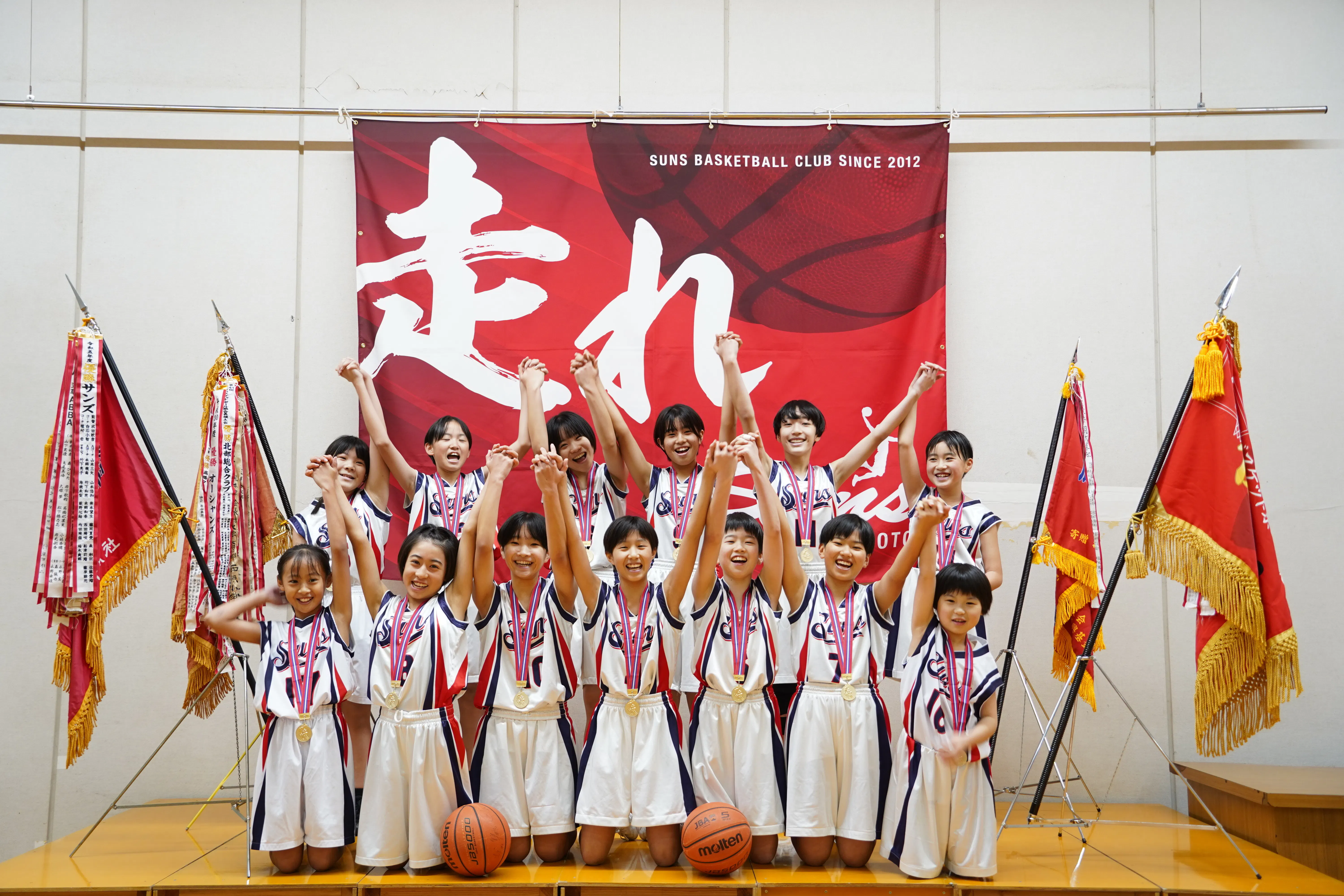 私たちは熊本県熊本市を拠点とし活動しているミニバスケットボールチーム「サンズ」です。2012年に創部、男子チームと共に「走れ」をチームスローガンとし、6年9名、4年2名、3年2名ととても少ないメンバーですが「熊本県NO.1」の大きな目標を掲げ、日々頑張ってきました。