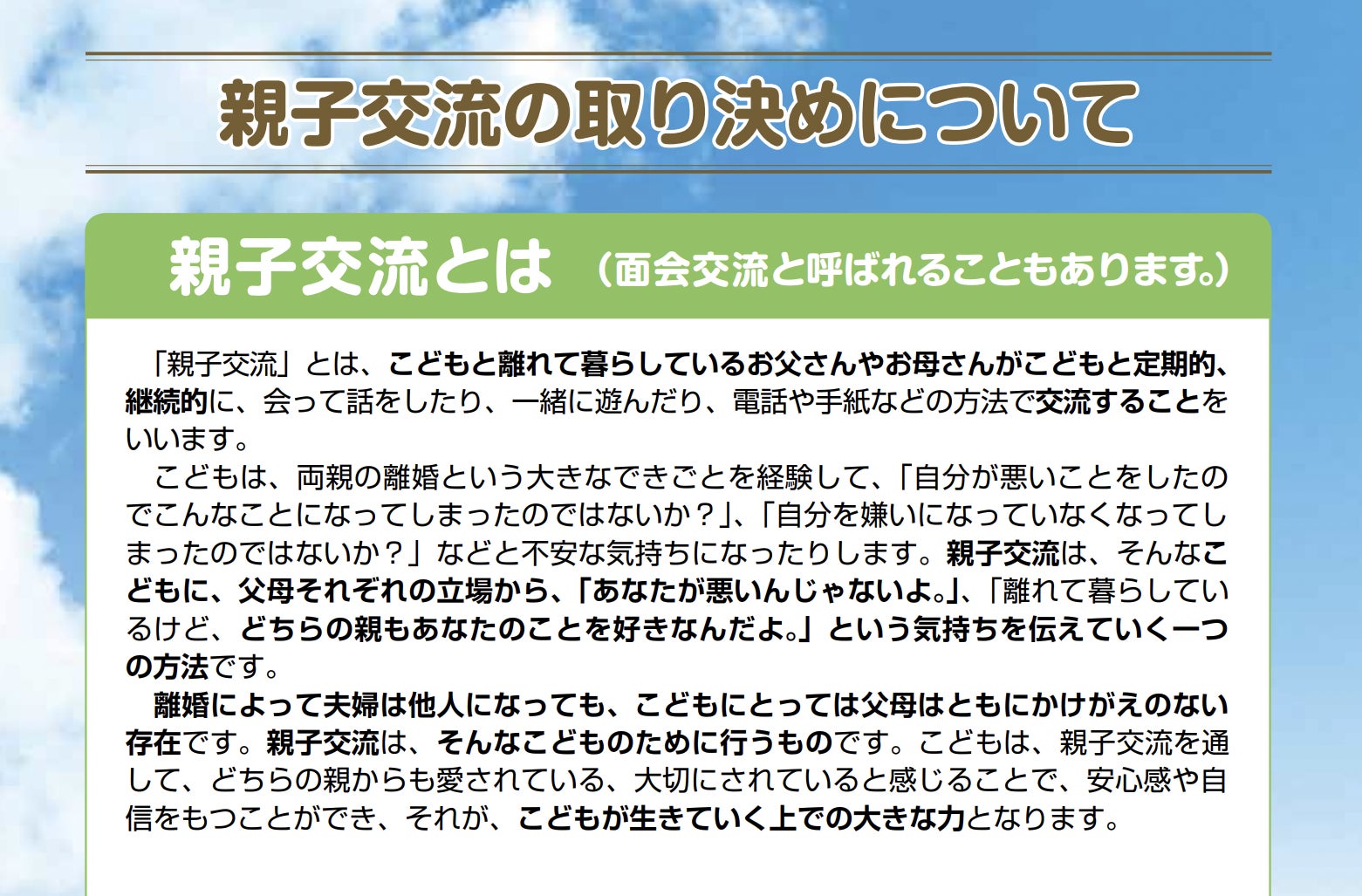 『面会交流』とは、両親の離婚、または別居により別れて暮らす親子や、祖父母と孫、兄弟姉妹など、様々な理由で離ればなれになってしまった家族が会って話したり、いっしょに遊んだり、電話や手紙などの方法で定期的、継続的に「親子・家族の時間」を過ごす事を意味し、全国に存在する民間の面会交流支援団体 のサポートのおかげで成り立っています。