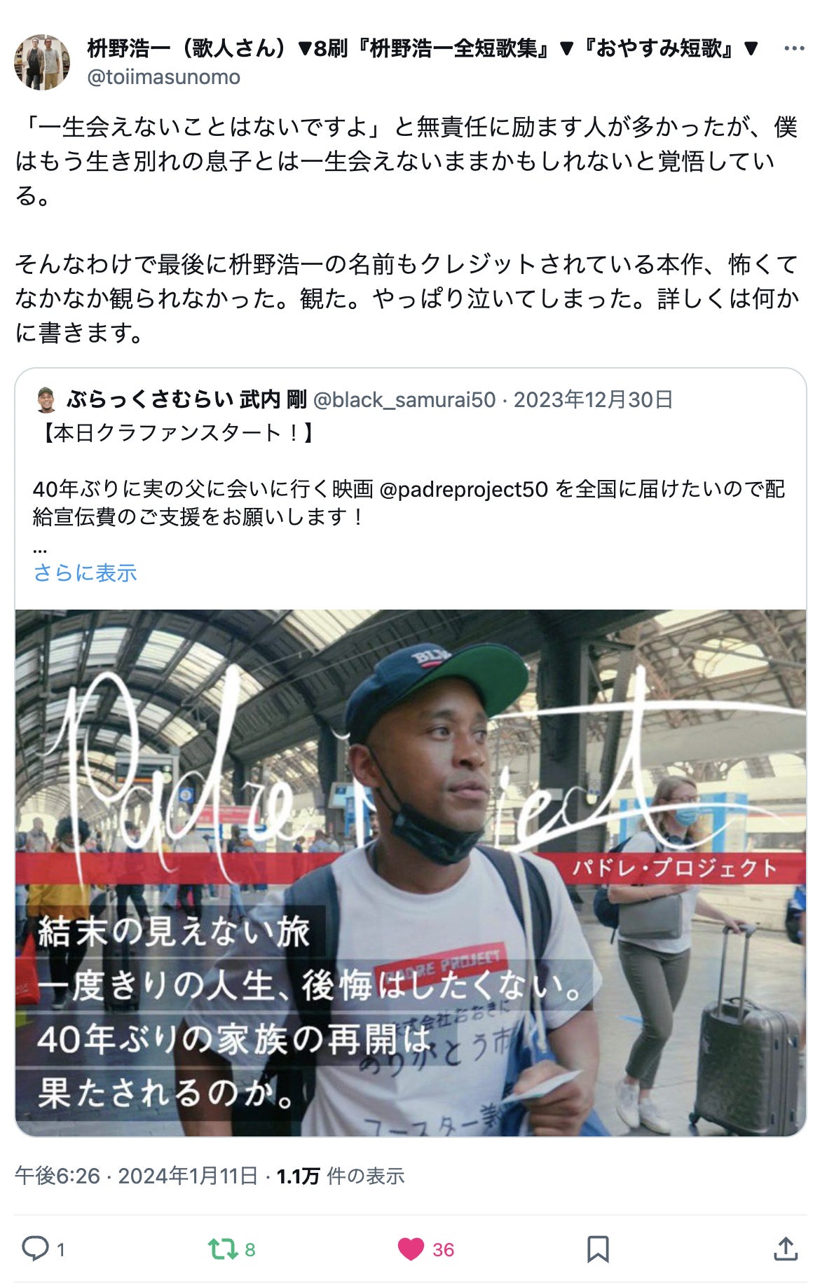 「40年ぶりに実の父親に会いに行く映画「パドレプロジェクト」を全国に届けたい!」プロジェクトオーナーの武内剛です。