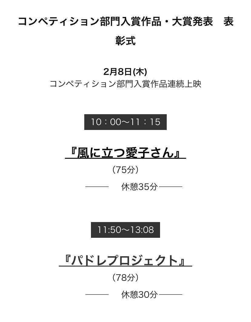 拙作、「パドレプロジェクト」の上映はお昼11:50〜(約80分)で、同日夕方18:15〜は、コンペ部門5作品の表彰式と大賞の発表セレモニーがあります。
